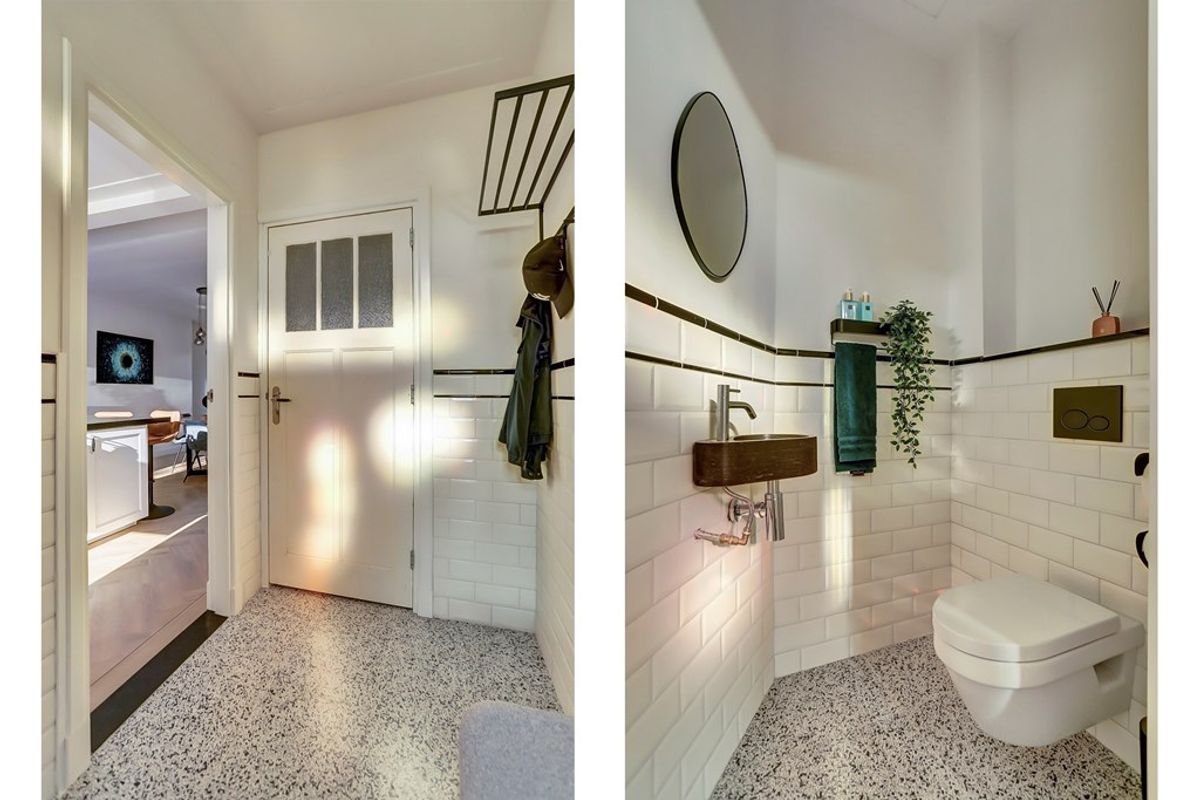 Binnenkomend stap je in de lichte hal met garderobe, waar de originele glas-in-loodramen meteen sfeer creëren. Vanuit hier heb je toegang tot het moderne toilet en loop je via een deur zo de sfeervolle woonkamer binnen.