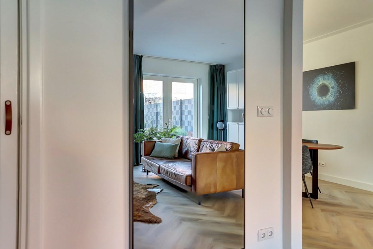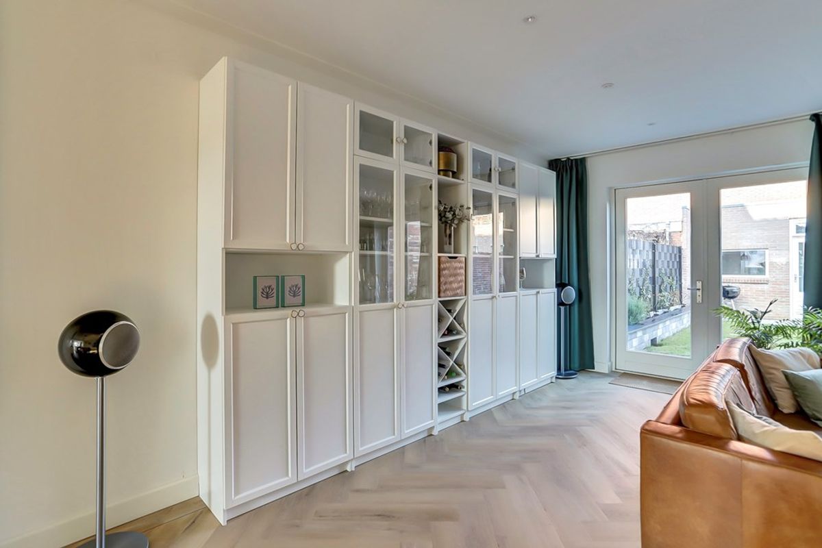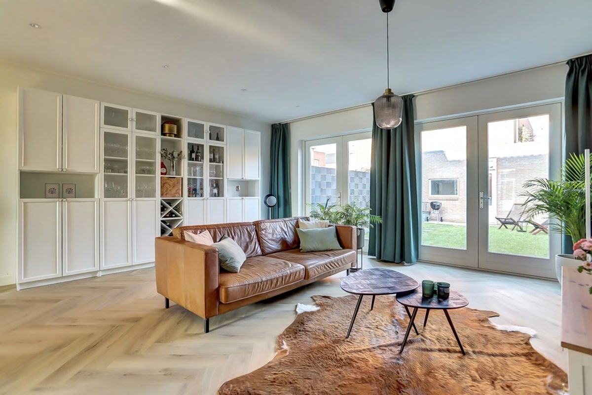 De royale, lichte zithoek met een tweetal openslaande deuren naar de tuin vormt de ideale plek voor gezellig samenzijn. Dankzij de brede raampartij stroomt het daglicht rijkelijk binnen. Vanuit deze ruimte heb je tevens toegang tot de trap-/kelderkast – perfect voor extra opbergruimte.
