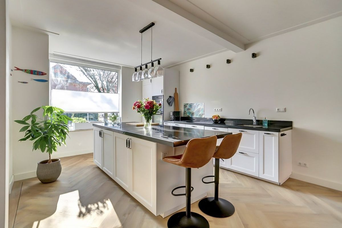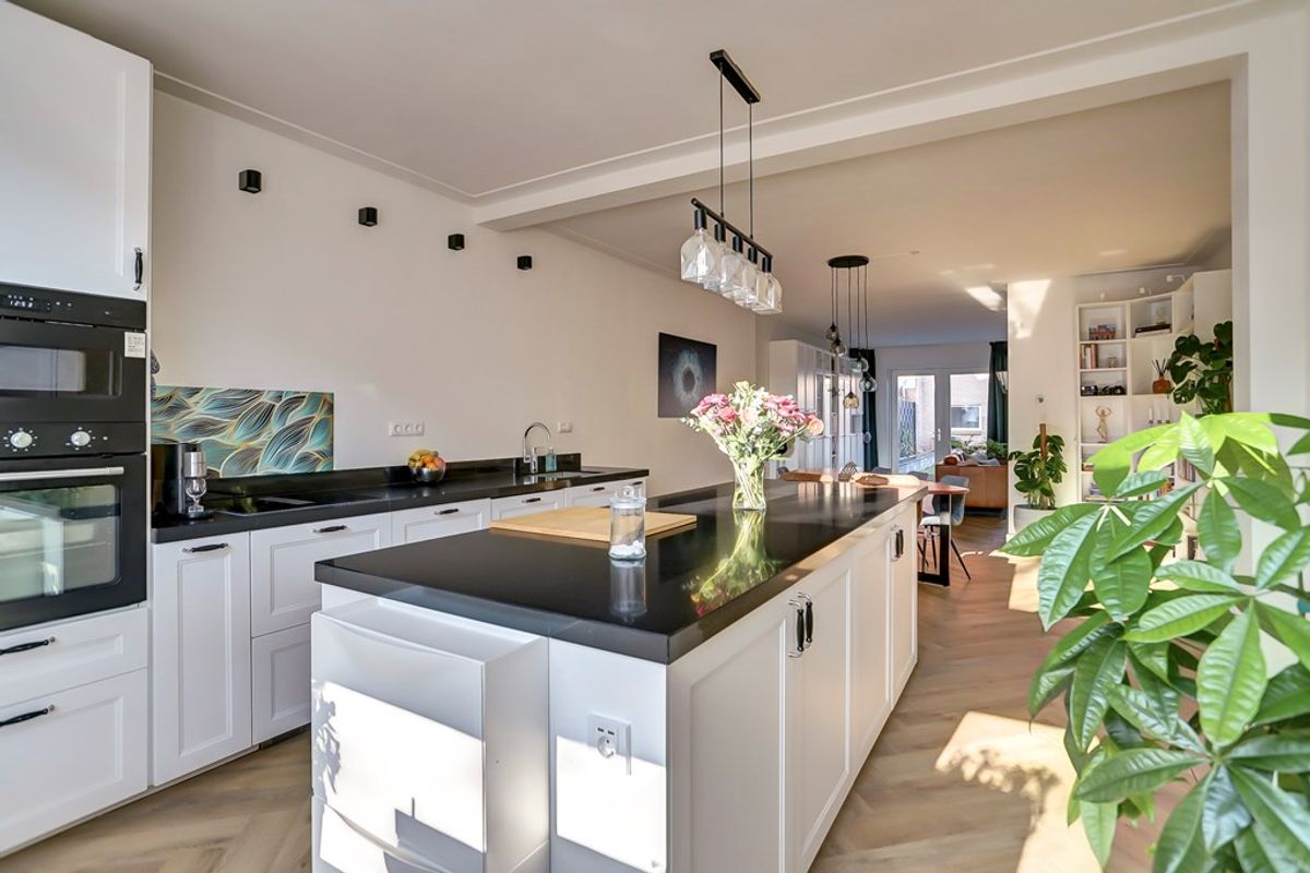 De lichte en ruime woonkamer met open keuken is een heerlijke plek om thuis te komen. Aan de voorzijde bevindt zich de moderne keuken met een stijlvol keukeneiland, dat volop werk- en opbergruimte biedt voor de enthousiaste thuiskok. De keuken is uitgerust met diverse inbouwapparaten, waaronder een vaatwasser, inductiekookplaat met geïntegreerde afzuiging, oven, magnetron en een koelkast met vriezer.