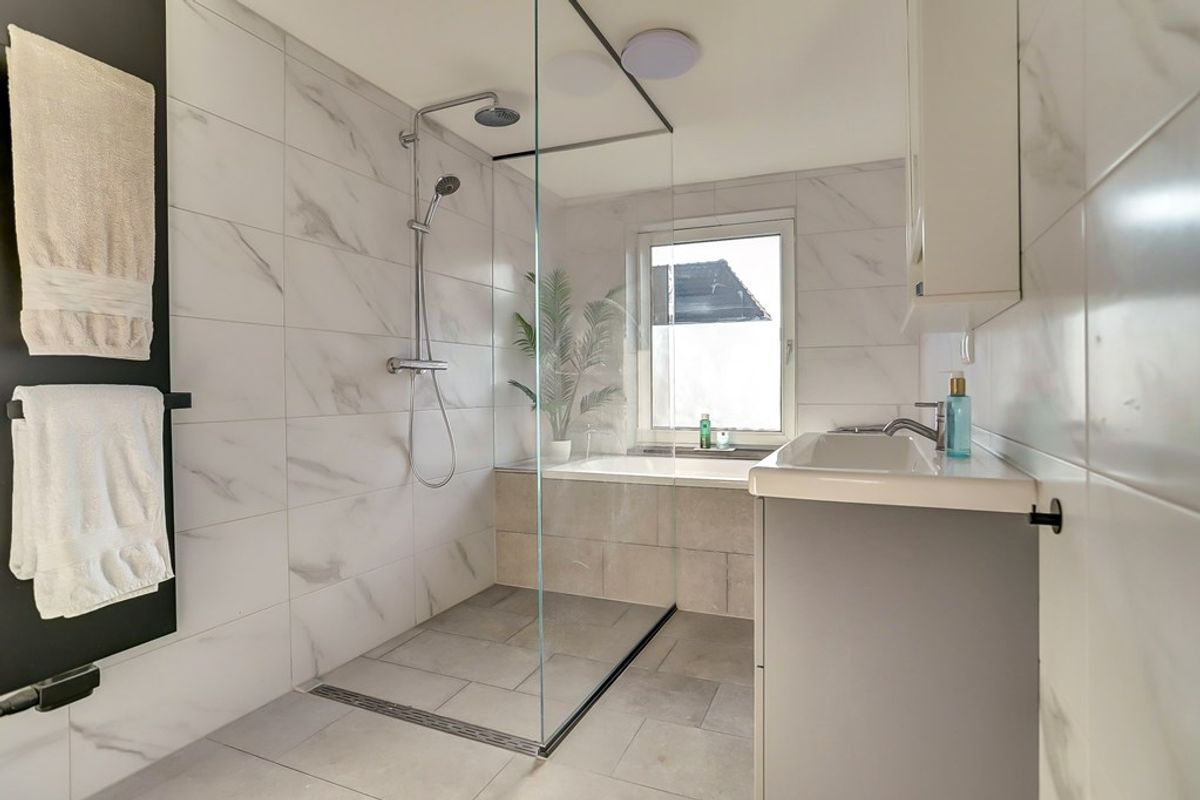 Aan de voorzijde van de woning ligt de eerste ruime slaapkamer, voorzien van een handige inbouwkast. Daarnaast bevindt zich ook aan de voorzijde de volledig vernieuwde badkamer, uitgerust met een ligbad, inloopdouche, hangend toilet, wastafelmeubel en designradiator. Zowel de wanden als de vloeren zijn stijlvol doorgetegeld.
