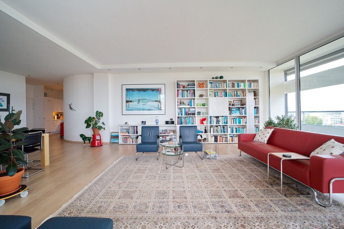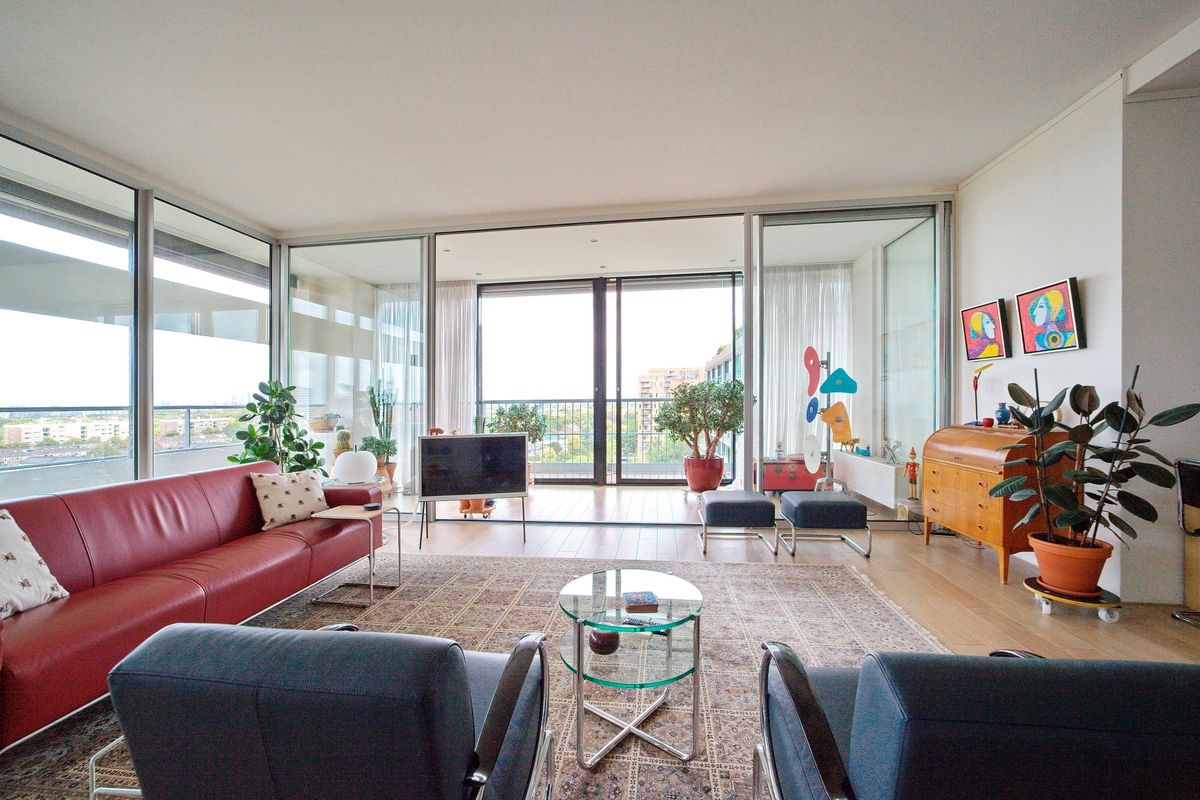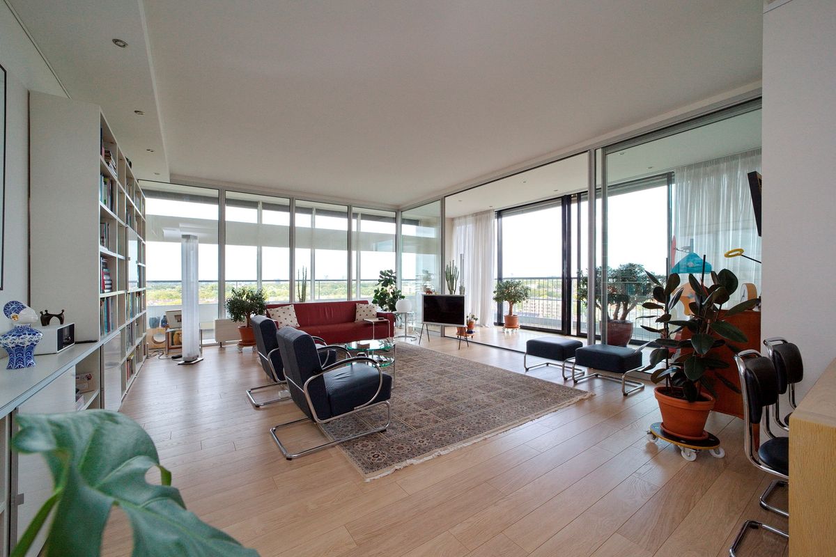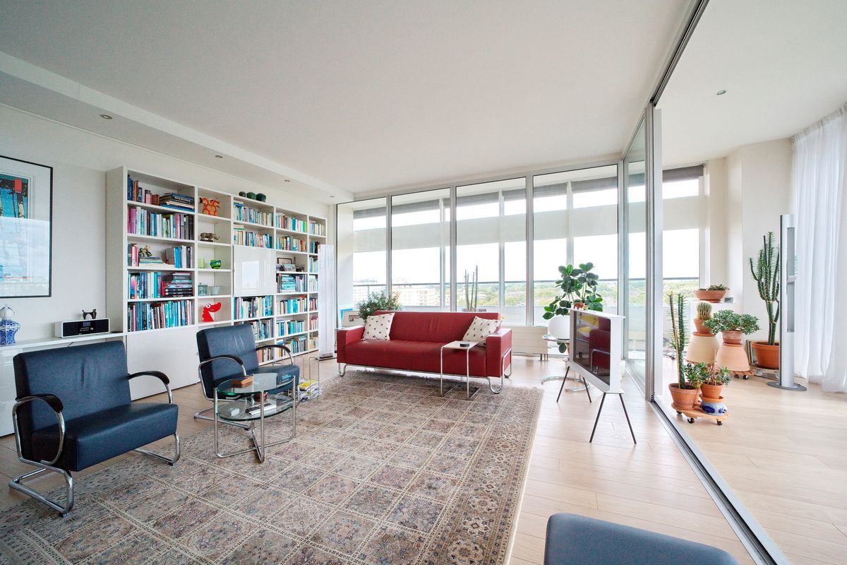De zeer ruime woonkamer is omringd door hoge ramen vanaf de grond tot aan het plafond.