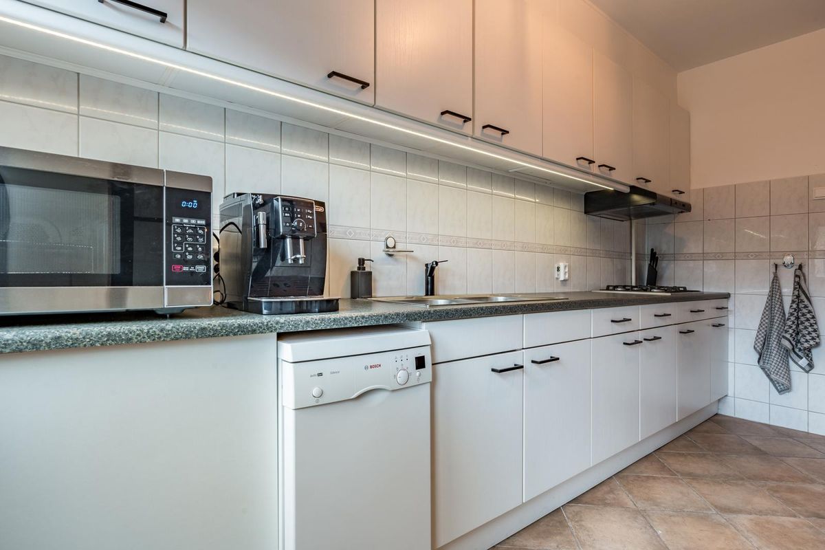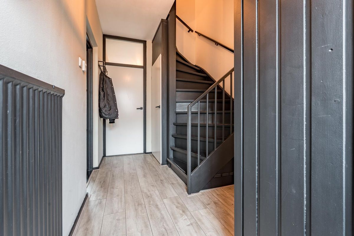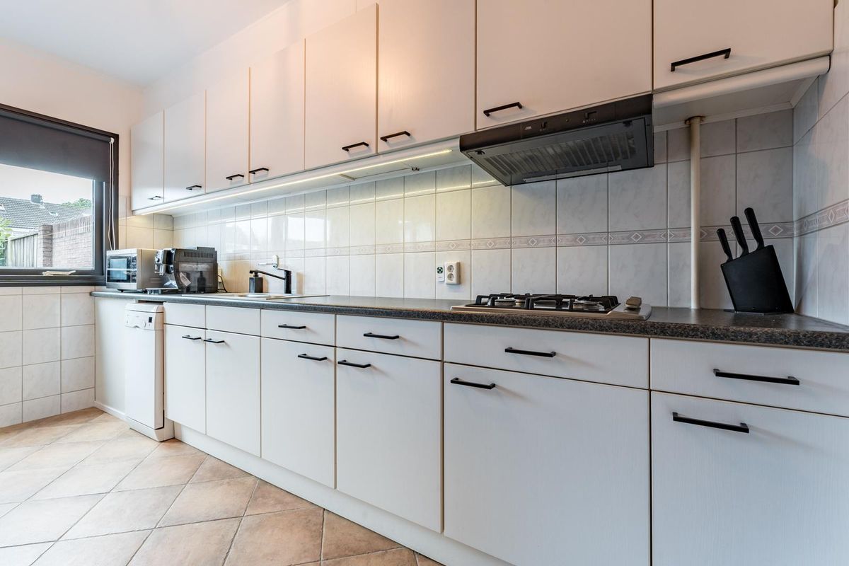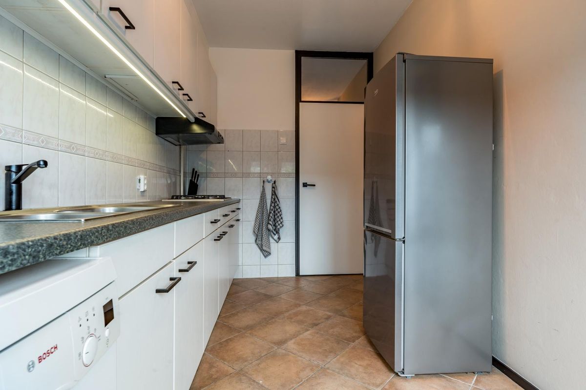 Begane grond: hal met trapopgang en toilet. Woonkamer met schuifpui, dichte keuken voorzien van gaskookplaat en afzuigkap.