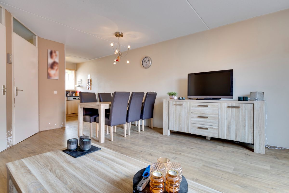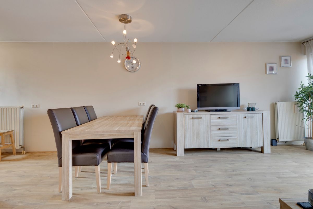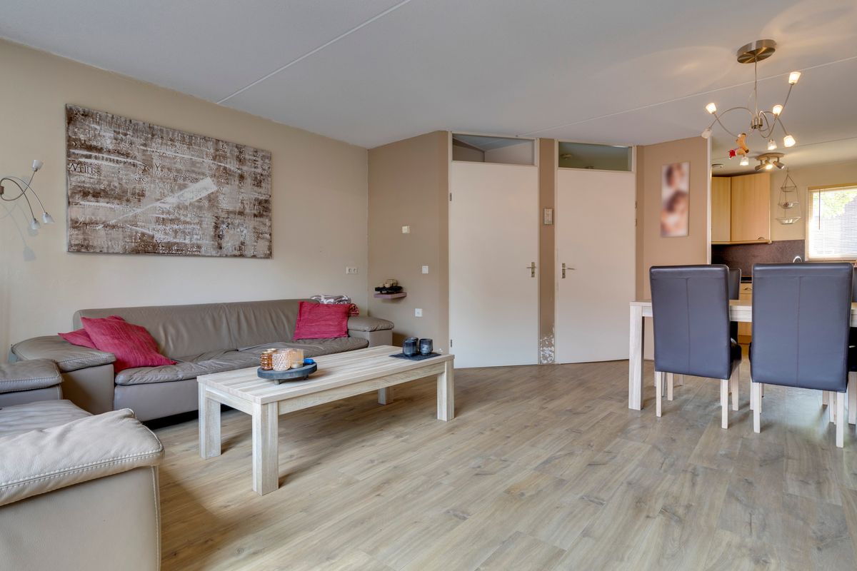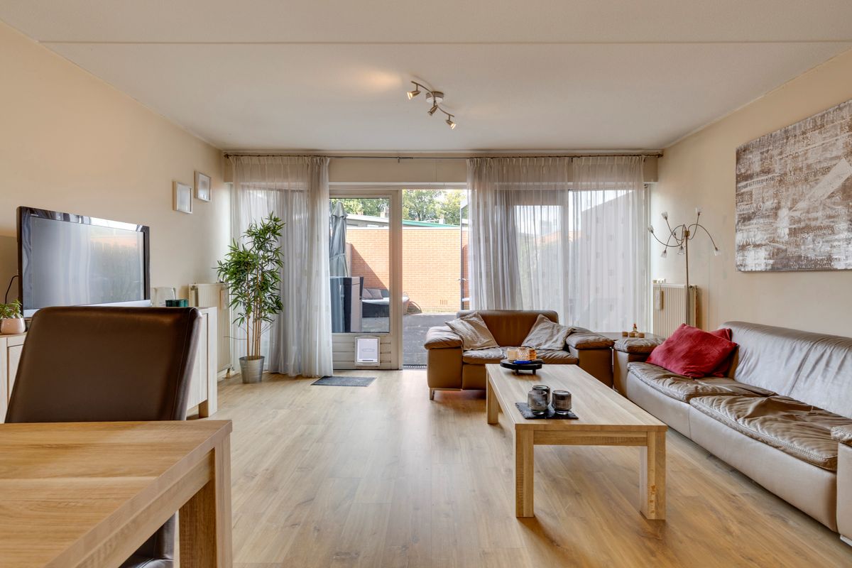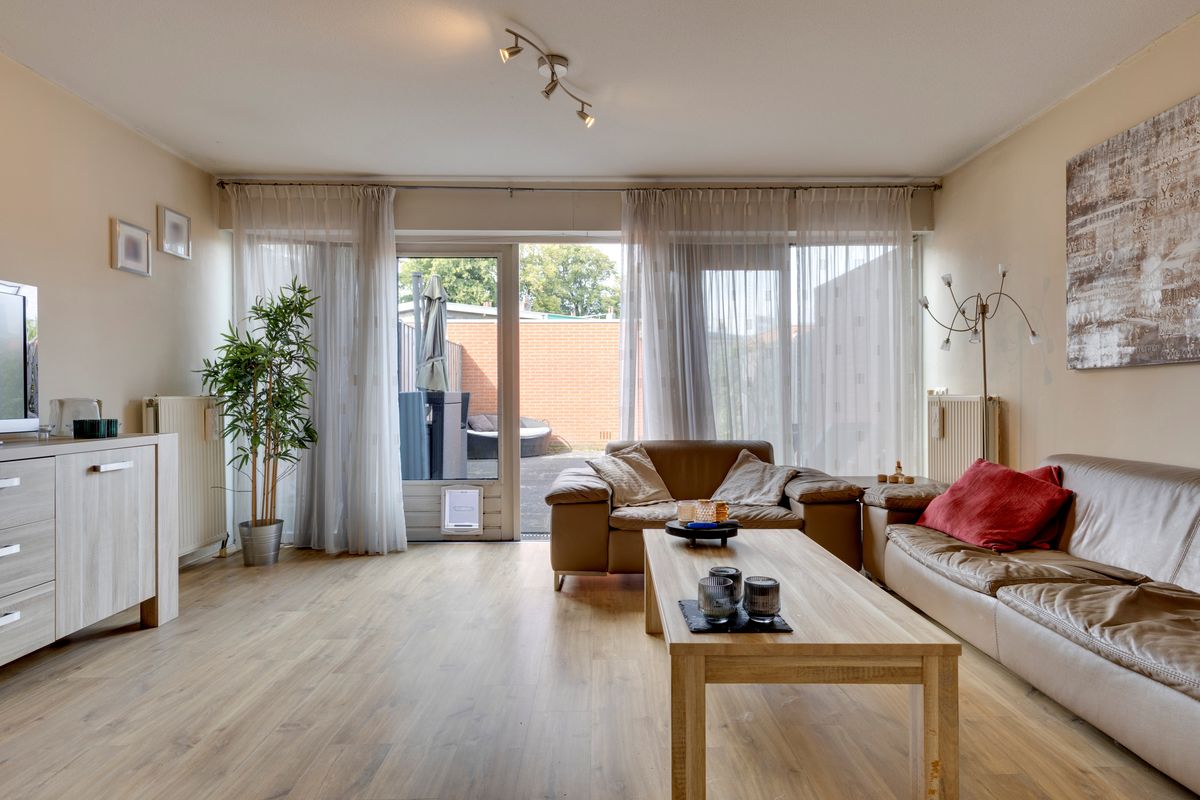 De ruime woonkamer met veel lichtinval door de grote glaspartij. Door de openslaande deuren hebben we toegang tot de geheel betegelde onderhoudsvriendelijke tuin.