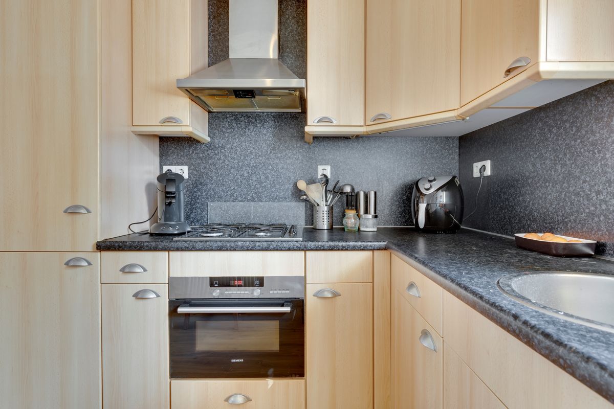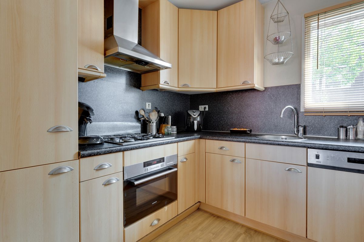 Aan de voorkant van de woning ligt de open keuken met inbouwkoelkast, gaskookplaat, afzuigkap, oven, vaatwasser en veel opbergruimte.