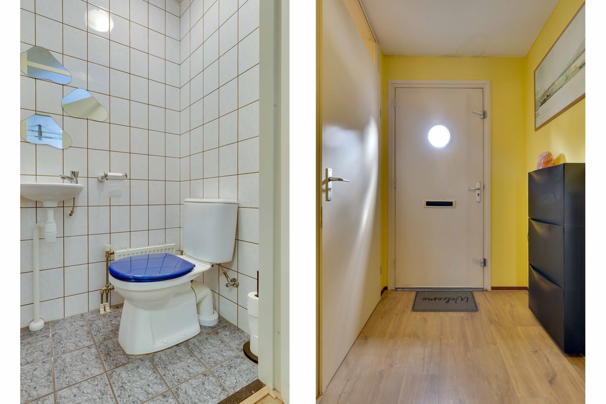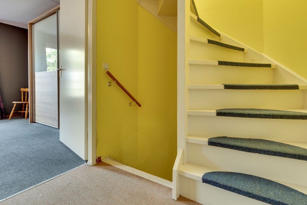 We betreden de woning via de hal, met toilet, meterkast en de trap naar de eerste verdieping.