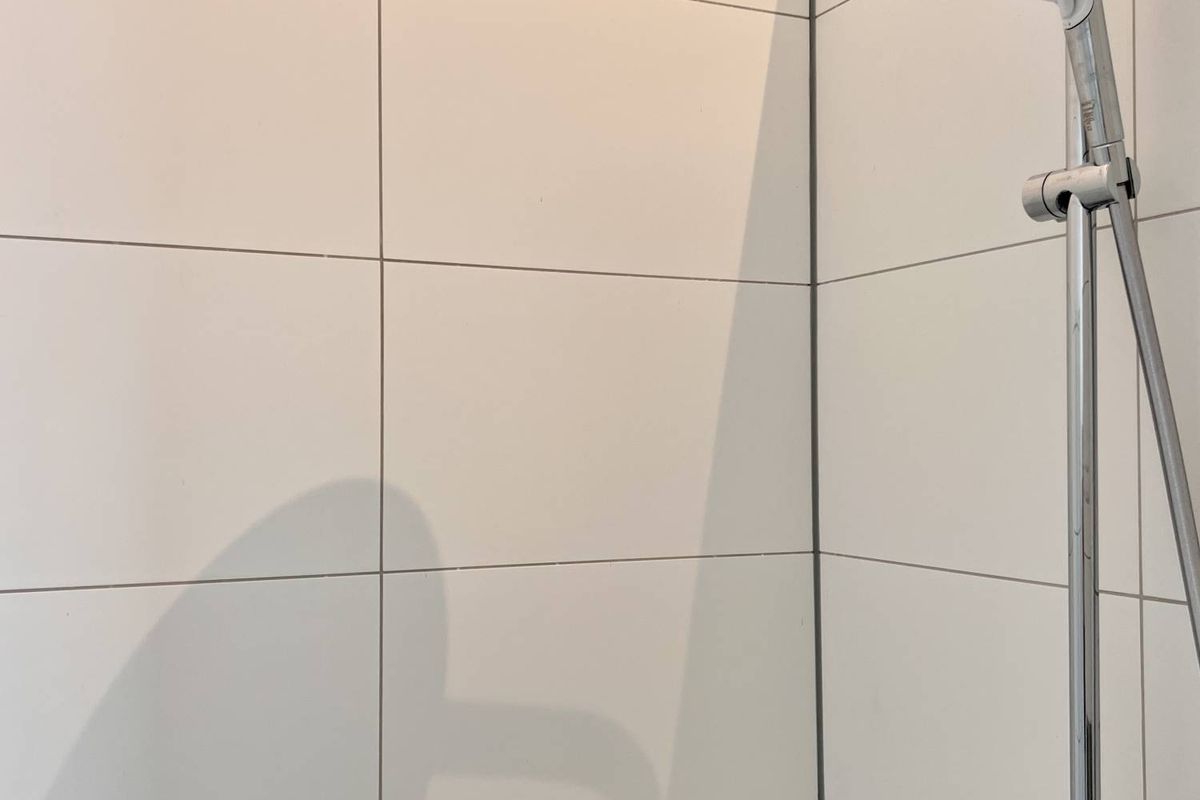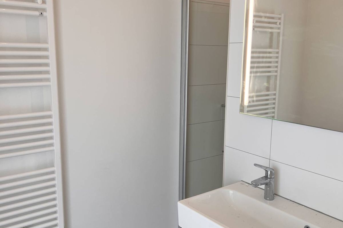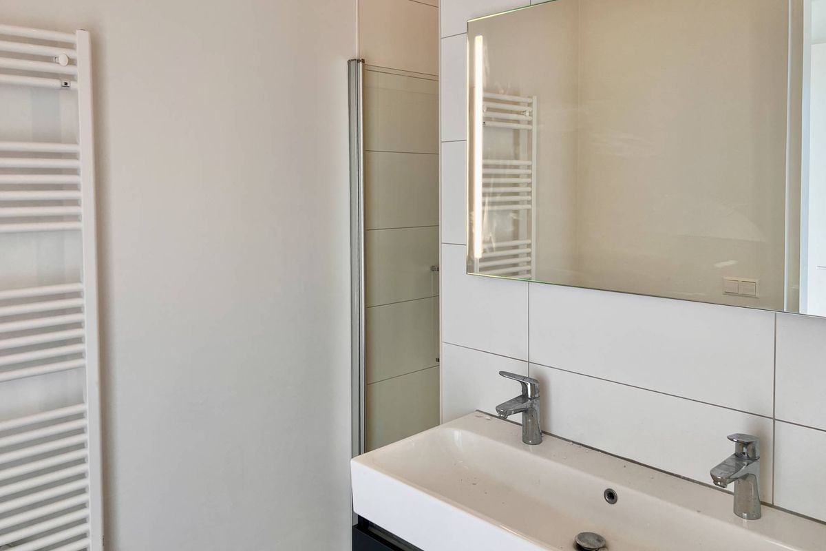 2de hal vanuit de woonkamer met toegang tot ruime berging, wc met fonteintje. Badkamer voorzien van wastafel, inloopdouche en wasmachine + droger. Een ruime slaapkamer met openslaande deuren naar de tuin en een grote slaapkamer met zicht op het park.