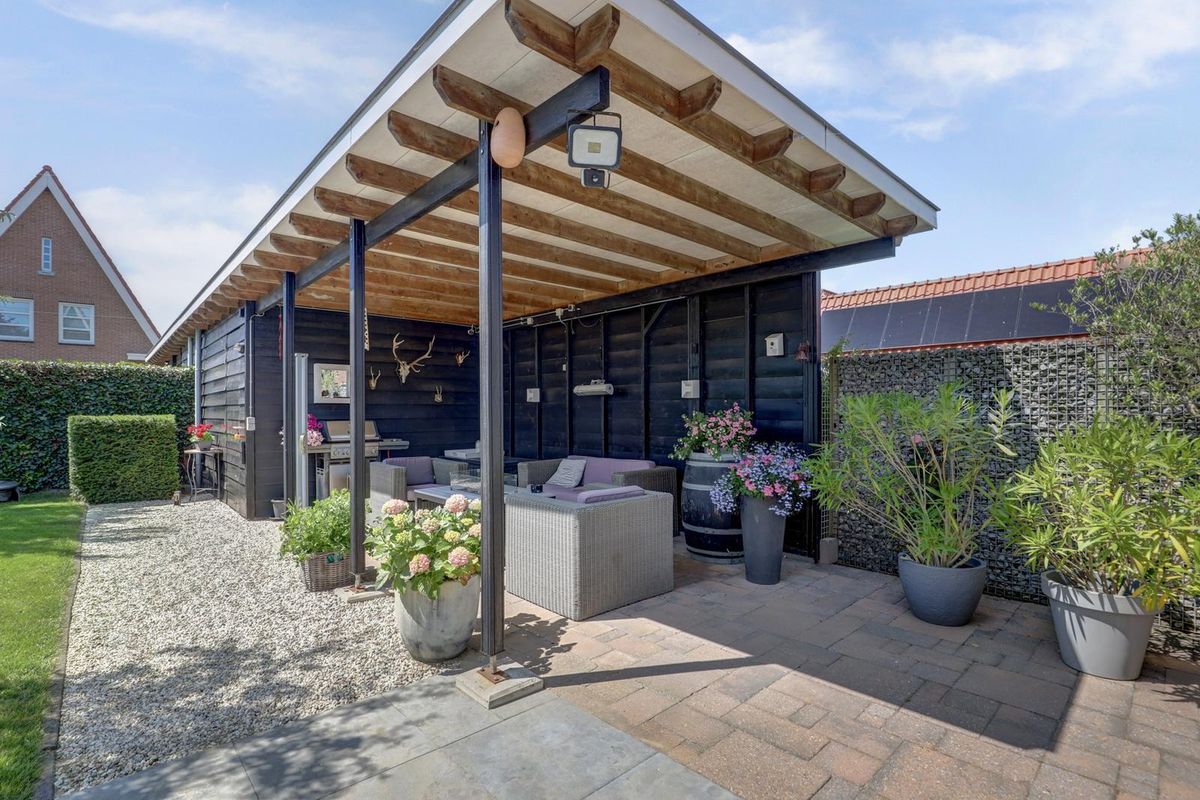 De zonnige tuin rondom de woning is een oase van rust en vrijheid. De tuin loopt volledig om het huis heen, wat niet alleen zorgt voor een groene beleving aan alle zijden, maar ook optimale privacy biedt. Het geheel is fraai aangelegd met een combinatie van gazon, bestrating en borders. Een sfeervolle vijver met waterplanten vormt het hart van de tuin en draagt bij aan een ontspannen sfeer. Onder de royale, houten overkapping is het heerlijk vertoeven, of het nu zomer is of het voorjaar zich aandient. Het terras biedt volop ruimte voor een loungeset of eettafel en er zijn diverse zitplekken gecreëerd om op elk moment van de dag van de zon te kunnen genieten.