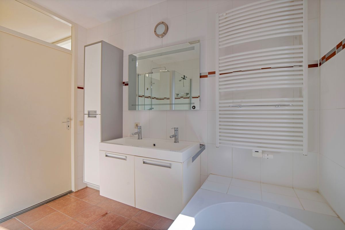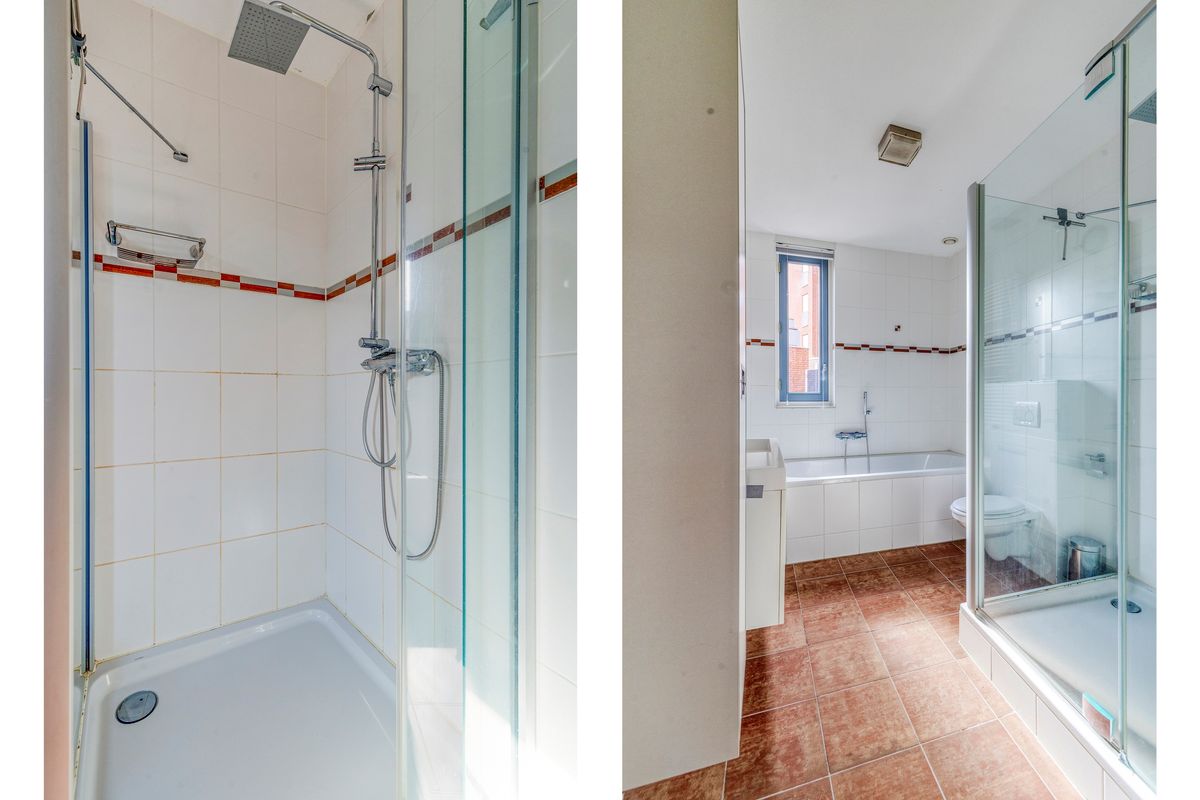 De luxe badkamer (2,87 x 2,33) is voorzien van volledig wit betegelde wanden en bronskleurige vloertegels. De badkamer is voorzien van een ligbad met thermostaatkraan, douchecabine met thermostaatkraan, zwevende toilet, badkamermeubel met dubbele wastafel, designradiator en vloerverwarming.