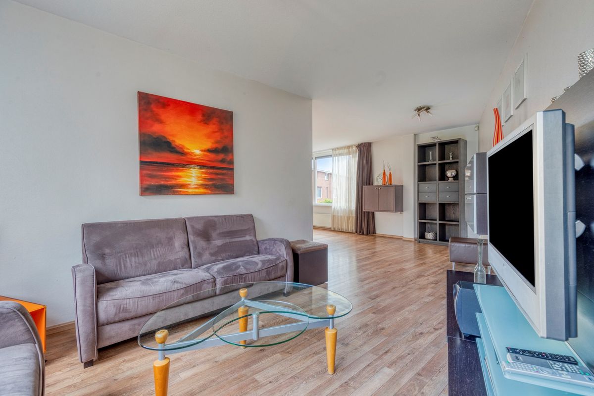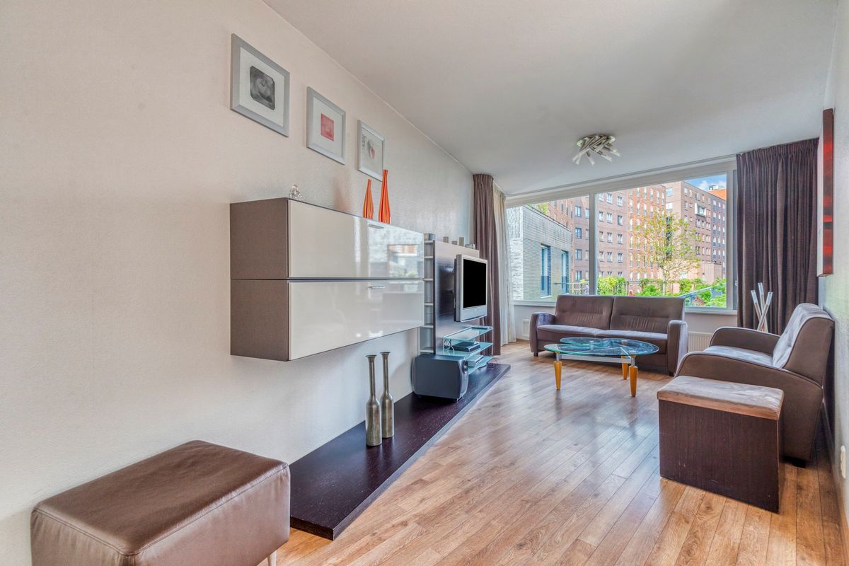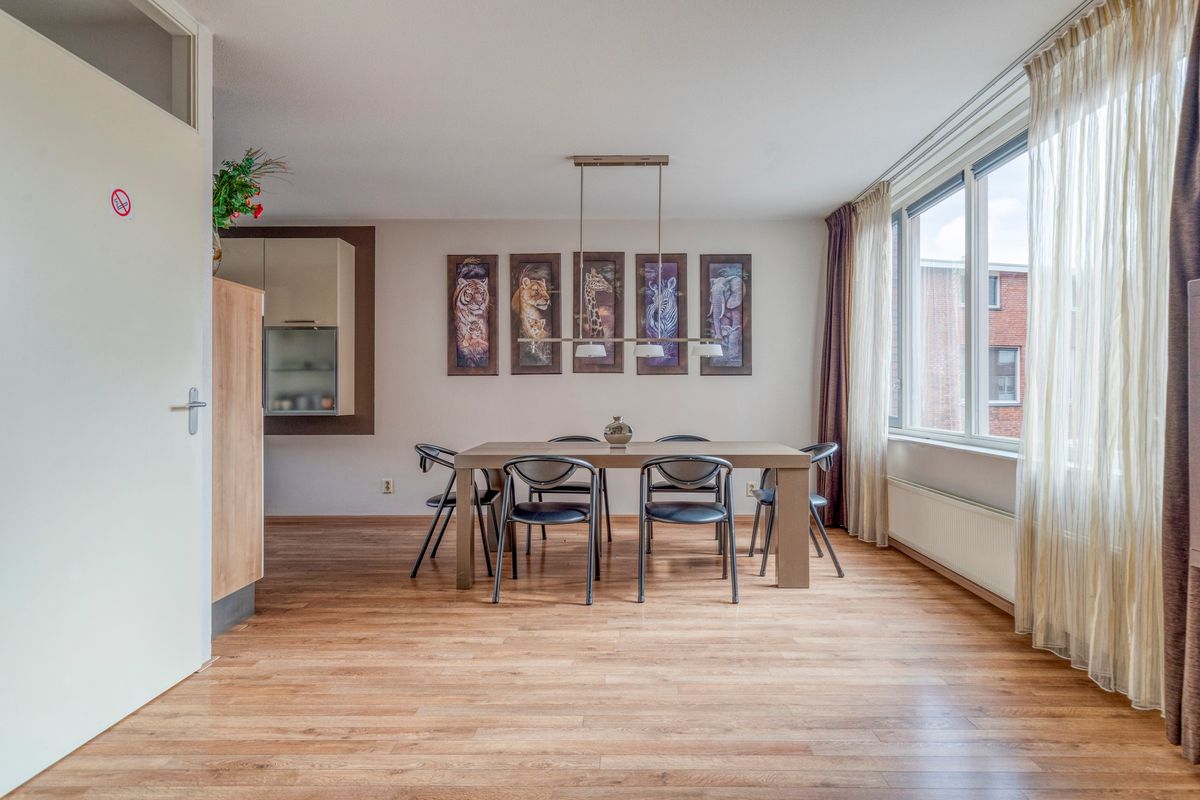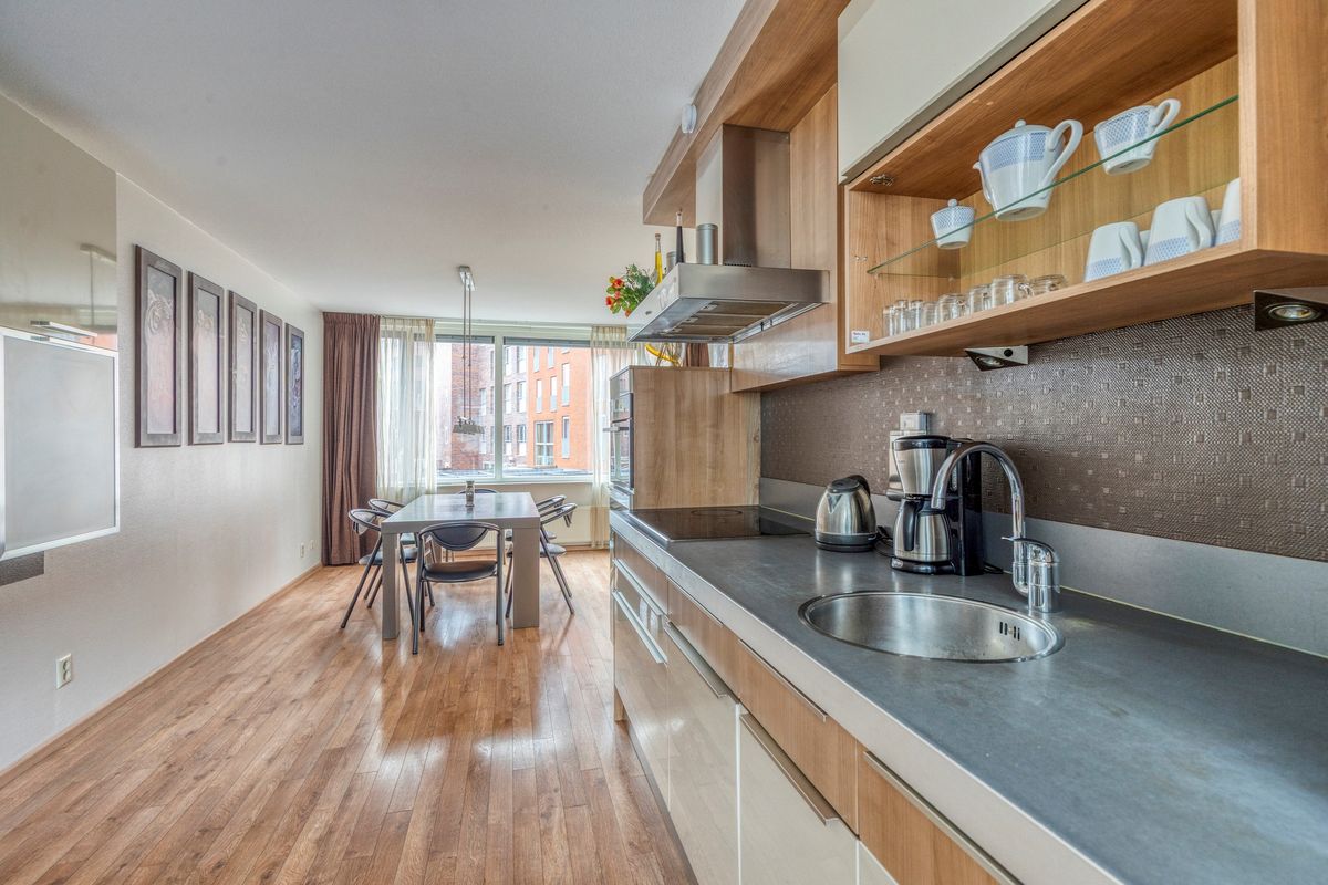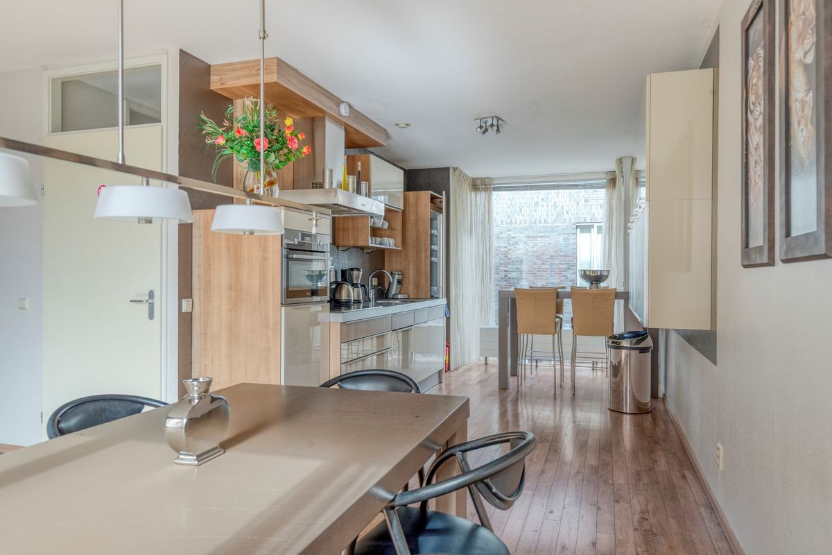 De royale woonkamer met open keuken (53 m²) is voorzien van veel lichtinval door de grote raampartij en biedt een fraai uitzicht op de binnentuin en rivier de Merwede.