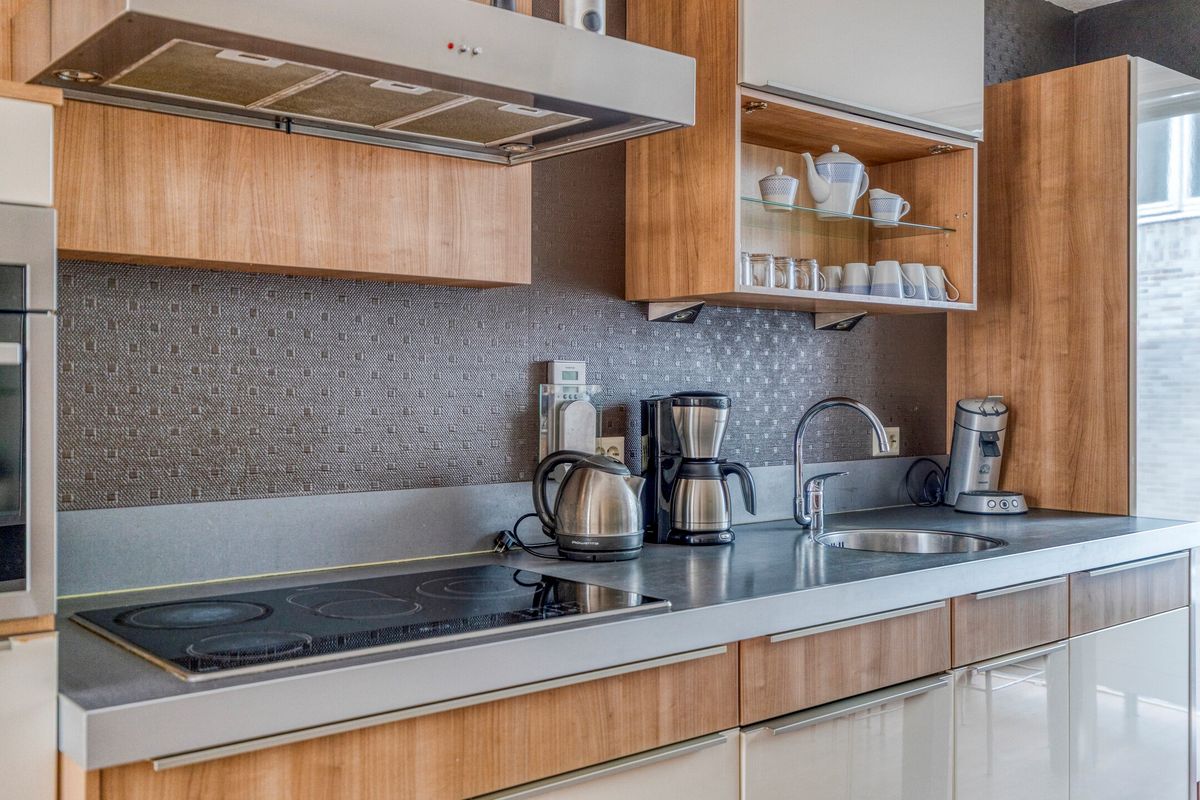 De luxe open keuken (4,80 x 2,97) is uitgevoerd in magnolia- en notenhouten kleurstelling en voorzien van een grijs kunststof aanrechtblad, veel kastruimte en diverse inbouwapparatuur, te weten een combi oven/magnetron, keramische kookplaat, rvs afzuigschouw, geïntegreerde vaatwasser en een koel/vriescombinatie. Tevens beschikt de keuken over een erker met fraai uitzicht.