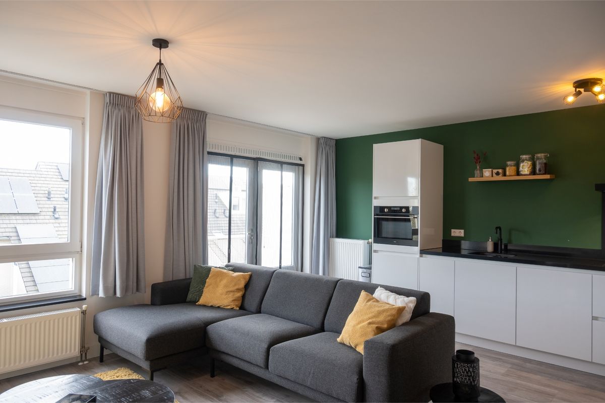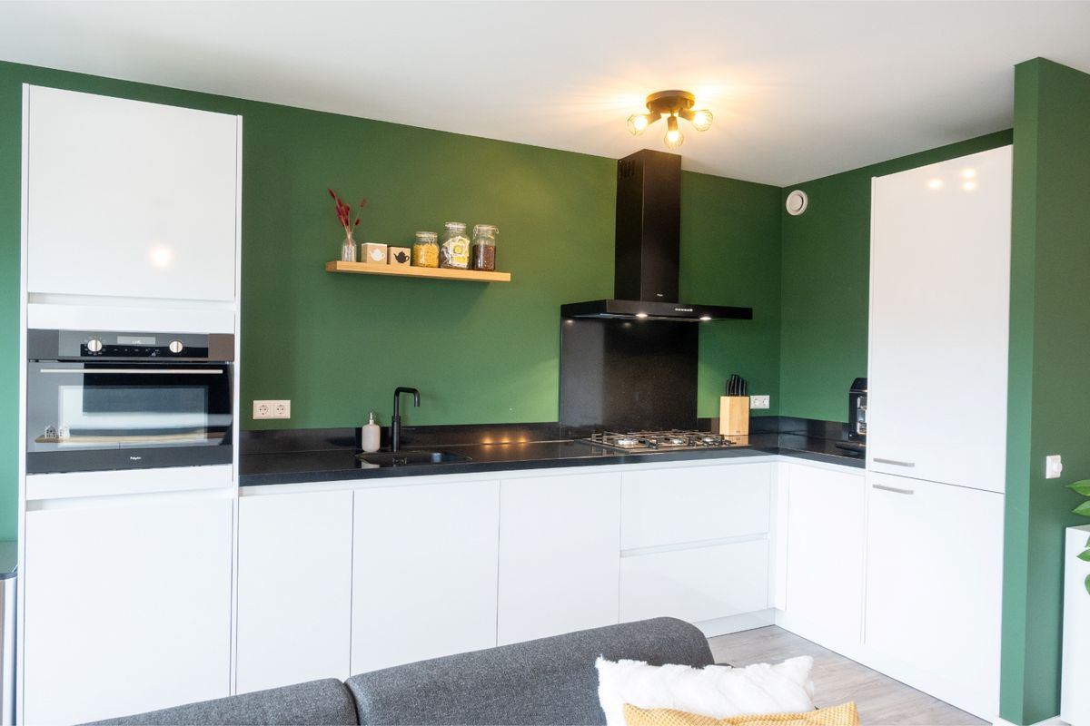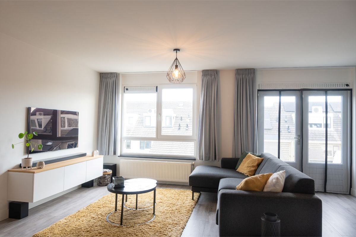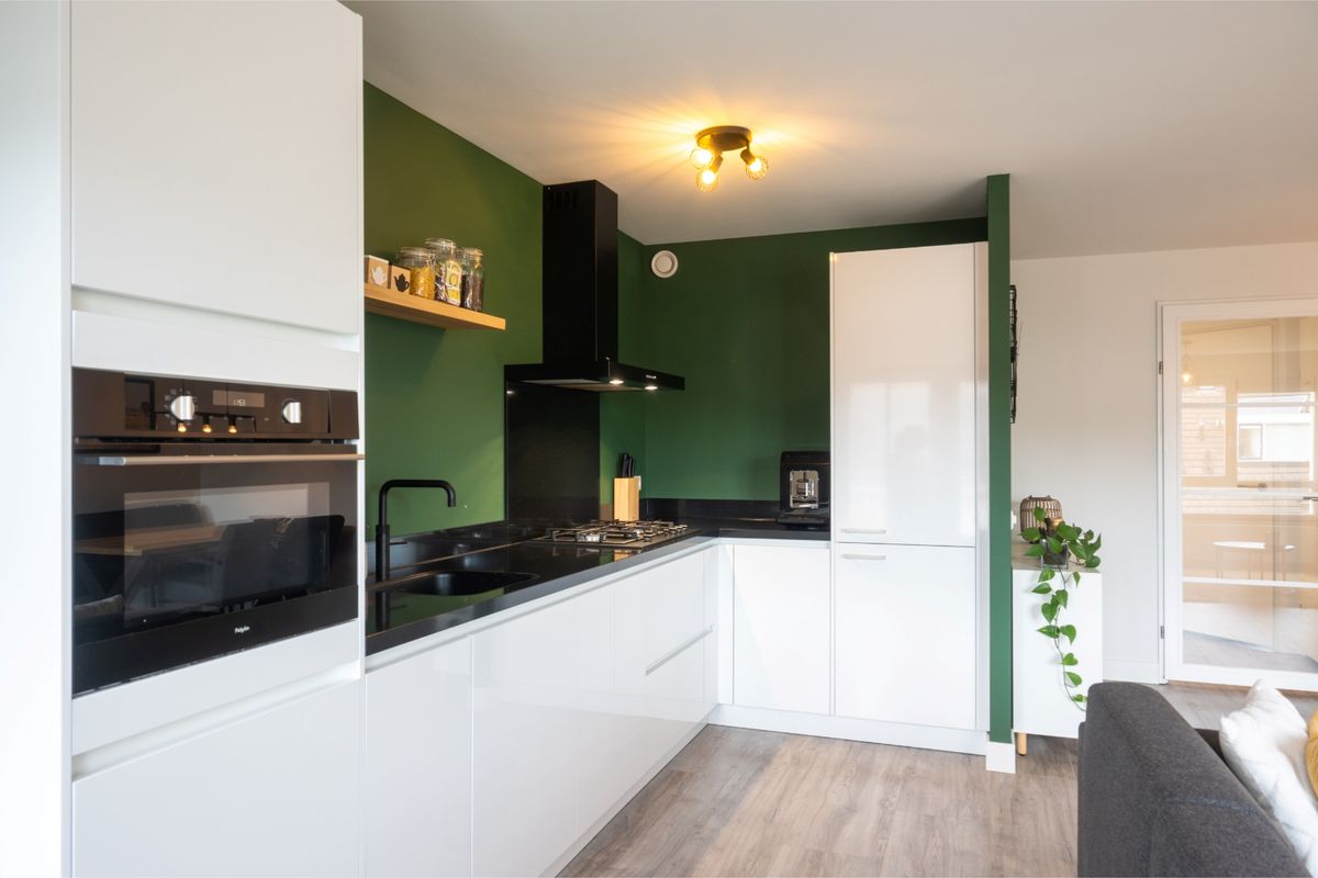 De woonkamer is lekker licht, met een moderne open keuken. Deze staat in een hoekopstelling en is voorzien van diverse inbouwapparatuur, zoals vaatwasser, 5-pits gasfornuis, koel-/vriescombinatie, combi-oven/magnetron en een Quooker. Vanuit de woonkamer heb je toegang tot het balkon.