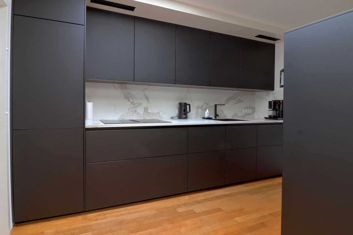 Aan de achterzijde is de woning uitgebouwd, waardoor een heerlijke eetkamer met extra zitgedeelte is ontstaan — voorzien van een lichtkoepel en dubbele openslaande deuren naar de tuin. De halfopen keuken, vernieuwd in 2022, heeft een moderne uitstraling met antraciet fronten en een marmerkleurig werkblad. Alle denkbare inbouwapparatuur is aanwezig, waaronder een inductiekookplaat met afzuigsysteem (Siemens), vaatwasser, koelkast, combimagnetron, oven, magnetron.