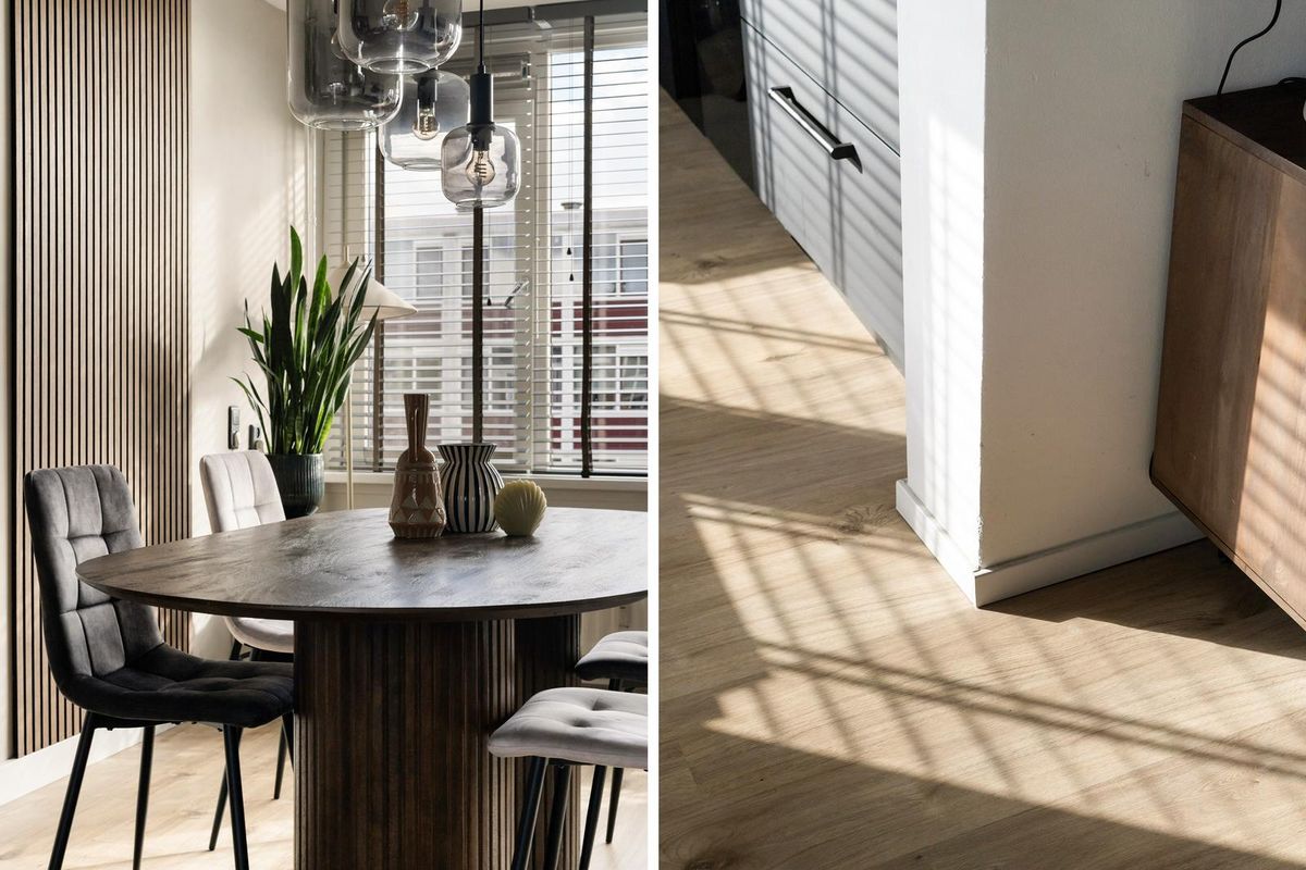 De zorgvuldig ingerichte woonkamer met grote raampartijen zorgt voor een prettige sfeer en biedt een fraai uitzicht over de omgeving. Het aangrenzende eetgedeelte heeft een fijne en praktische doorloop naar de keuken.