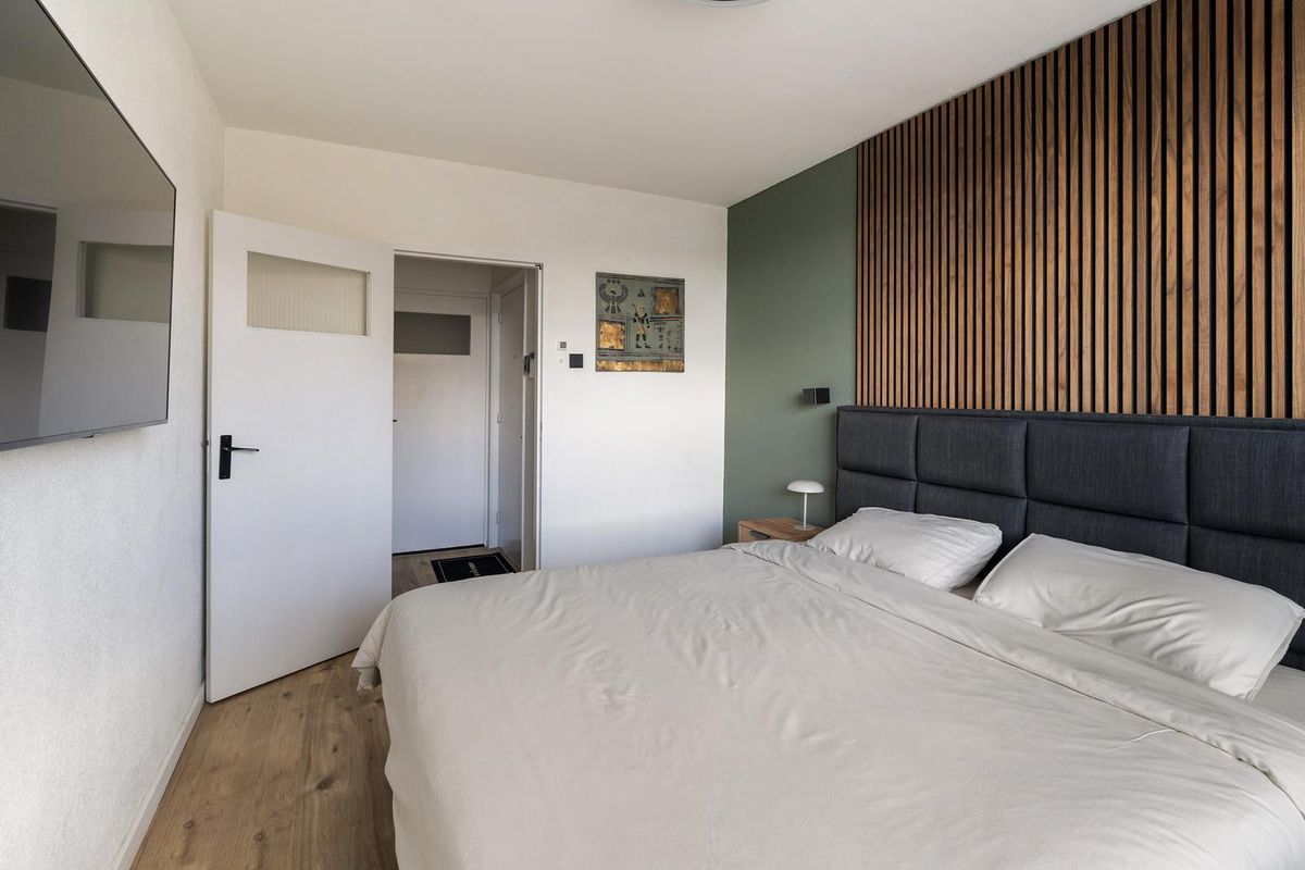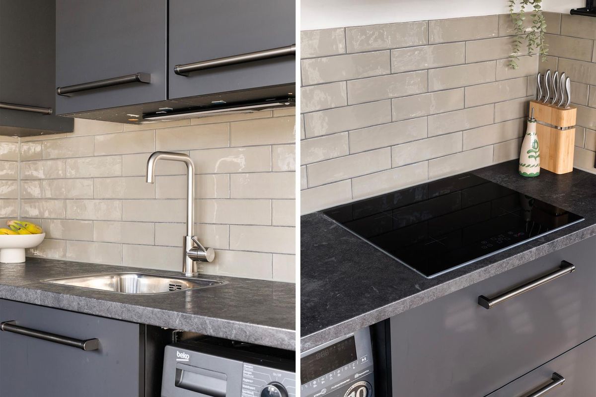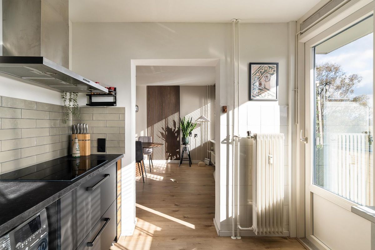De moderne open keuken in L-opstelling is uitgevoerd in een donkere tint en voorzien van diverse inbouwapparatuur, waaronder een combimagnetron, inductiekookplaat en RVS-afzuigkap. Het warme water wordt verzorgd door de elektrische boiler (eigendom). Hieronder bevindt zich een losse vaatwasser die, net als de wasmachine, achterblijft in de woning. Het geheel is afgewerkt met een strak kunststof werkblad. Via de deur bereik je het balkon.