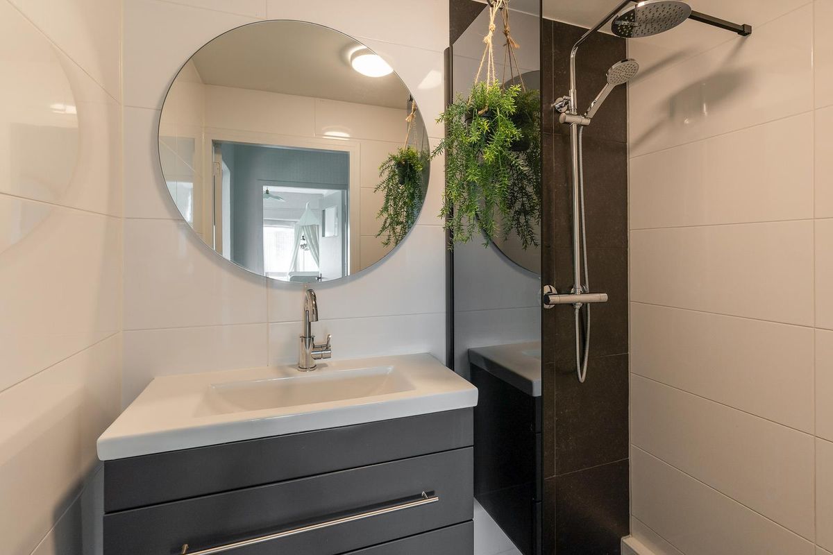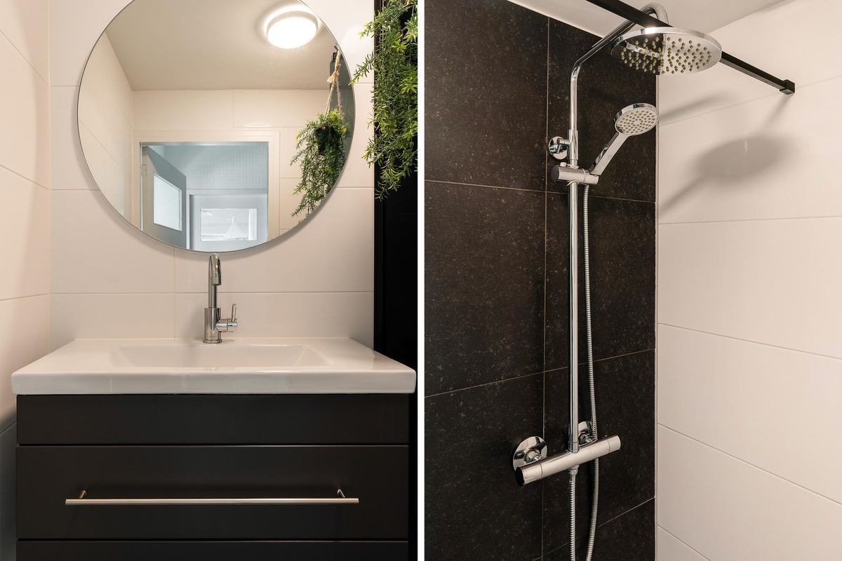 De modern ingerichte badkamer is ook tot aan het plafond betegeld in een combinatie van wit en antraciet. De ruimte is uitgerust met een inloopdouche met hand- en regendouchekop en een thermostaatkraan. De wastafel is voorzien van een net meubel met kastruimte door middel van lades en daarboven een ronde spiegel.