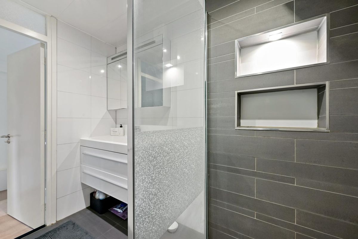 Ook praktisch is dit appartement goed doordacht: waar veel woningen in het complex de wasmachine in de keuken of badkamer hebben, beschikt dit appartement over een aparte wasruimte, netjes weggewerkt in een voormalige inbouwkast.