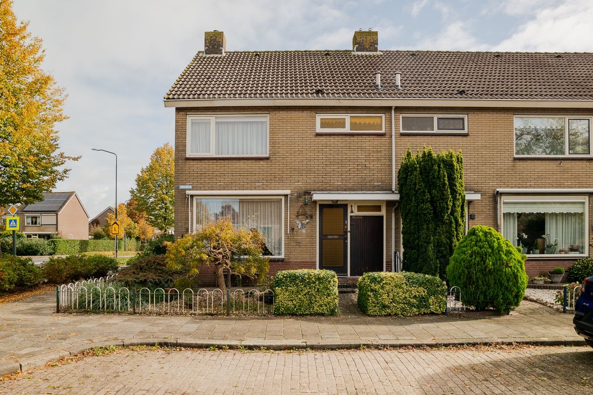 De ca. 3,5 meter diepe voortuin is voorzien van een sierhek welke doorloopt langs de zijde van de woning. Hier vind je diverse vaste beplanting, heggen en struiken afgewisseld met grind en siertegels. Een pad leidt naar de overdekte entree van de woning.