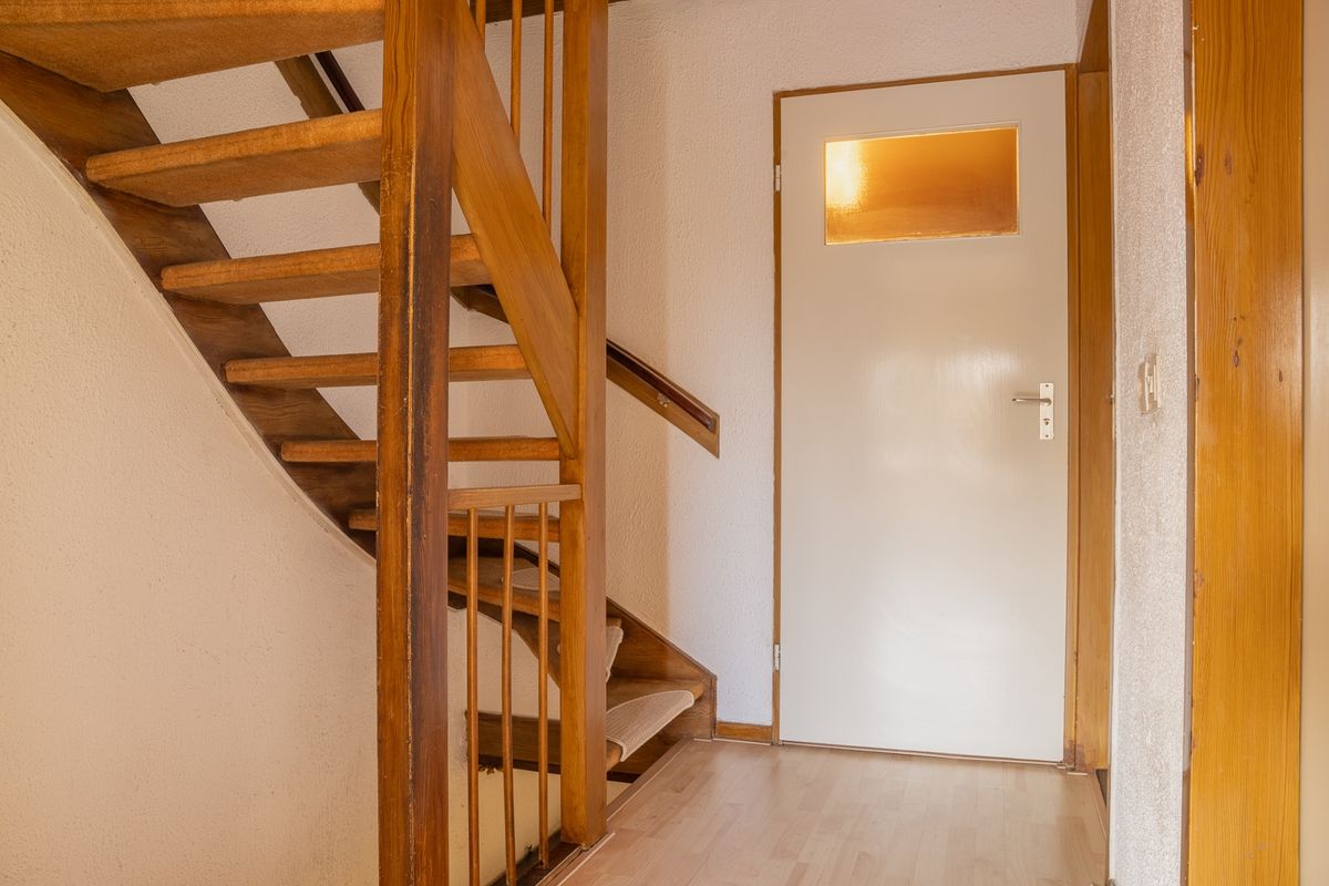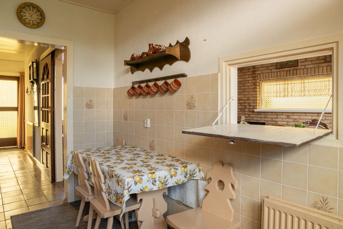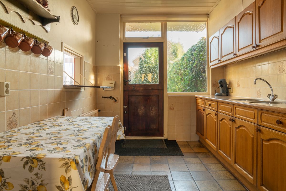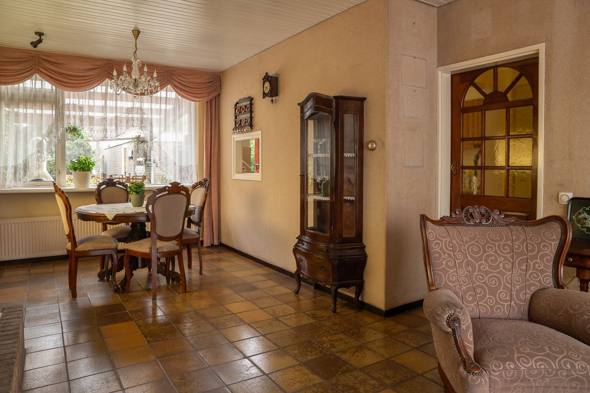 Overdekte entree in de hal voorzien van de nette toiletruimte voorzien van een staand toilet en een fonteintje, de meterkast, de trapopgang en een ruime trapkast. Vanuit de hal toegang tot zowel de woonkamer als de keuken. De doorzonwoonkamer is opgedeeld in een zitgedeelte dat zich bevindt bij de raampartij met zonnescherm. Het eetgedeelte is gericht op de raampartij aan de achterzijde en is uitgerust met een eigentijds en functioneel doorgeefluik naar de keuken. De eveneens karakteristieke jaren'70 schouw vormt een natuurlijke overgang tussen beide ruimtes. De ruime gesloten keuken biedt volop mogelijkheden. De keukenopstelling dateert uit 1992 maar is robuust gebouwd en voorzien van onder meer een gasfornuis, oven en koelkast. Vanuit de keuken is er directe toegang tot de achtertuin.