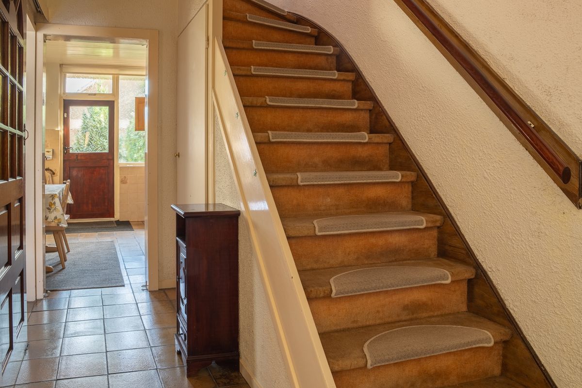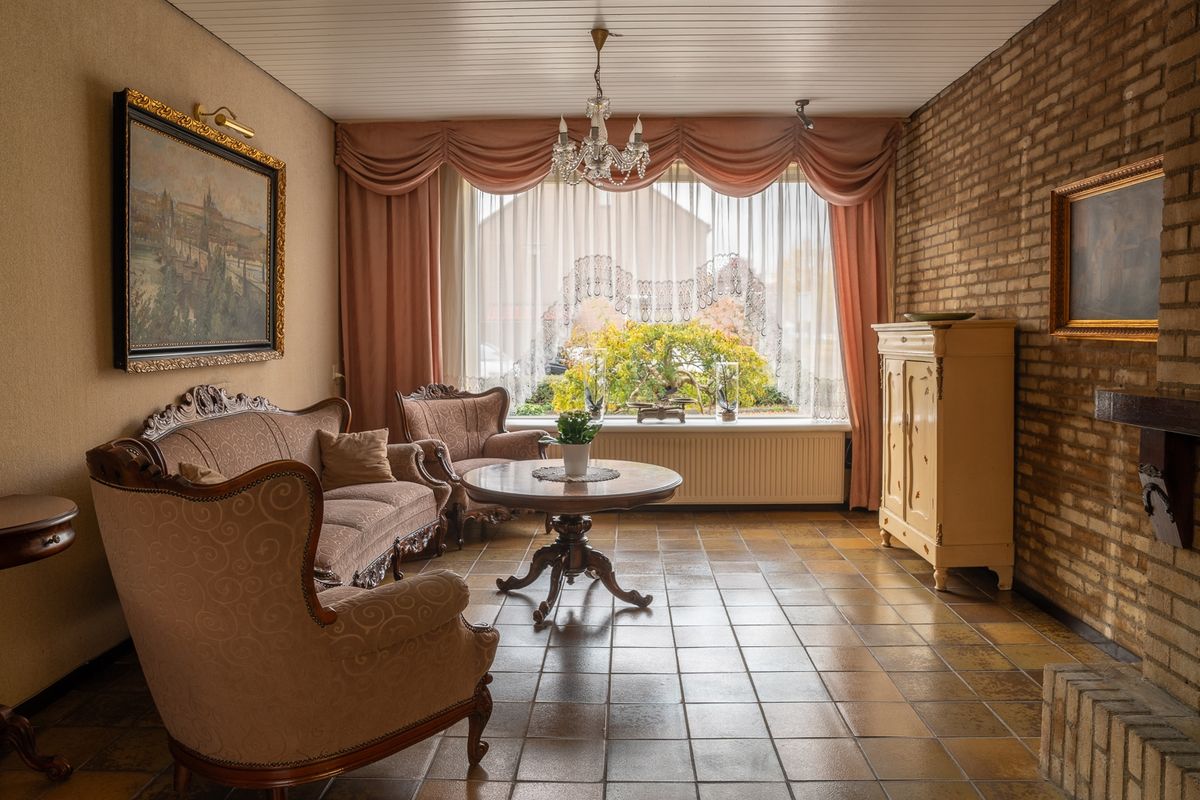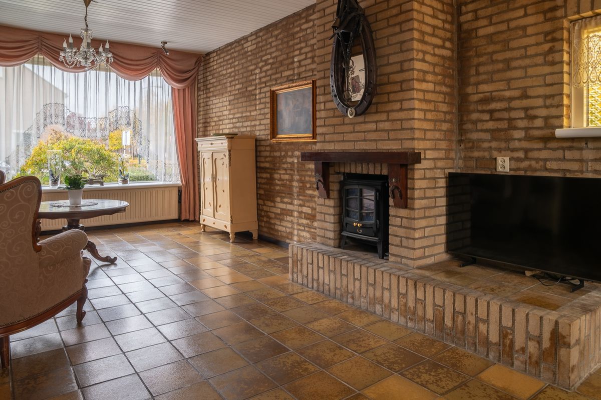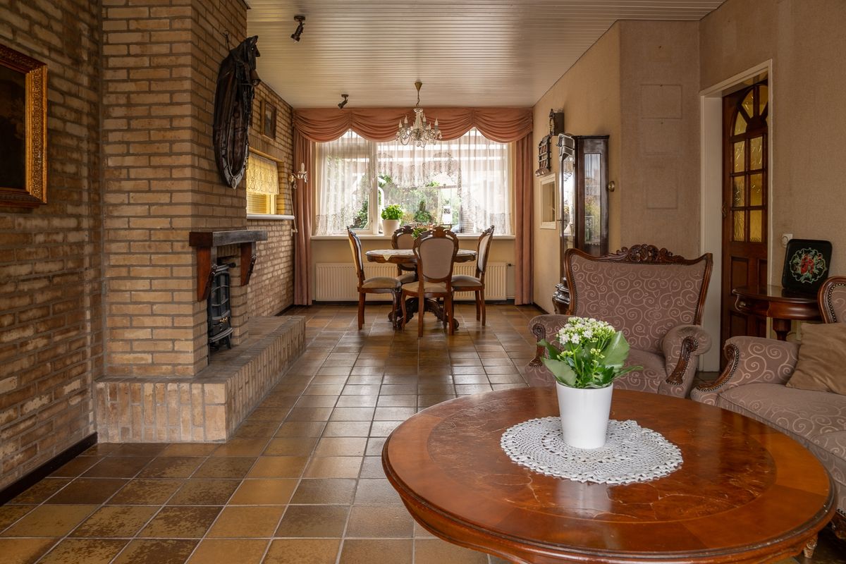 Overdekte entree in de hal voorzien van de nette toiletruimte voorzien van een staand toilet en een fonteintje, de meterkast, de trapopgang en een ruime trapkast. Vanuit de hal toegang tot zowel de woonkamer als de keuken. De doorzonwoonkamer is opgedeeld in een zitgedeelte dat zich bevindt bij de raampartij met zonnescherm. Het eetgedeelte is gericht op de raampartij aan de achterzijde en is uitgerust met een eigentijds en functioneel doorgeefluik naar de keuken. De eveneens karakteristieke jaren'70 schouw vormt een natuurlijke overgang tussen beide ruimtes. De ruime gesloten keuken biedt volop mogelijkheden. De keukenopstelling dateert uit 1992 maar is robuust gebouwd en voorzien van onder meer een gasfornuis, oven en koelkast. Vanuit de keuken is er directe toegang tot de achtertuin.