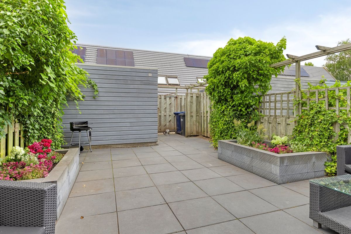 De achtertuin is recent compleet vernieuwd. Grote tegels worden hier afgewisseld met verhoogde, stenen borders met bloemen en planten en houten schuttingen waar klimplanten gretig tegenop groeien.