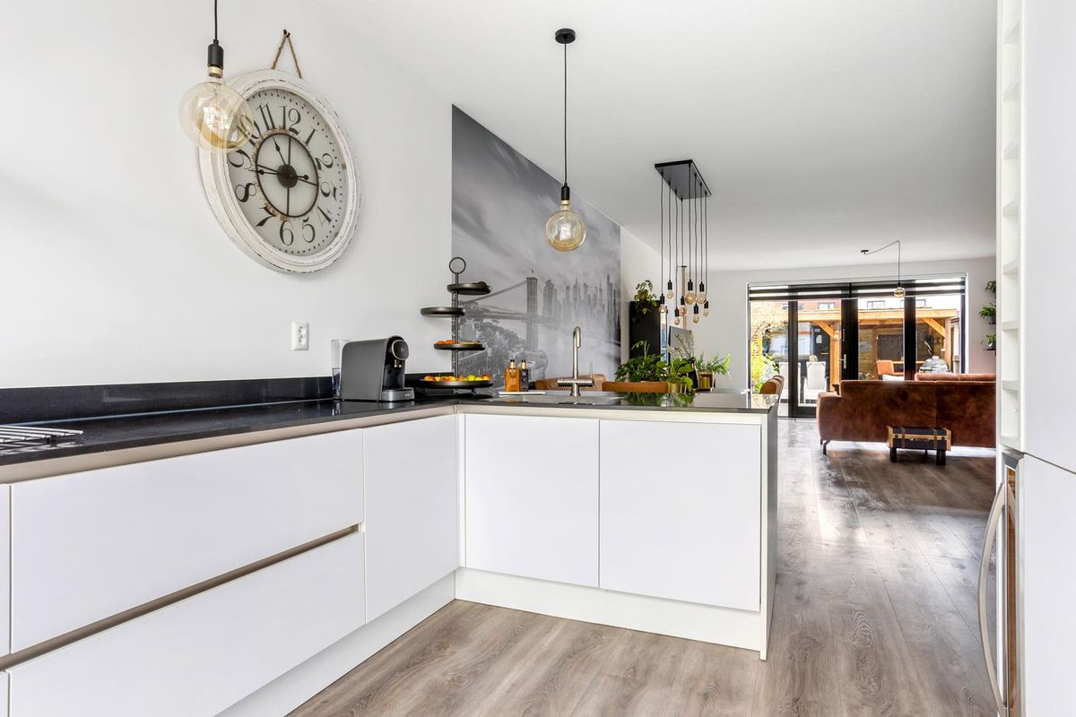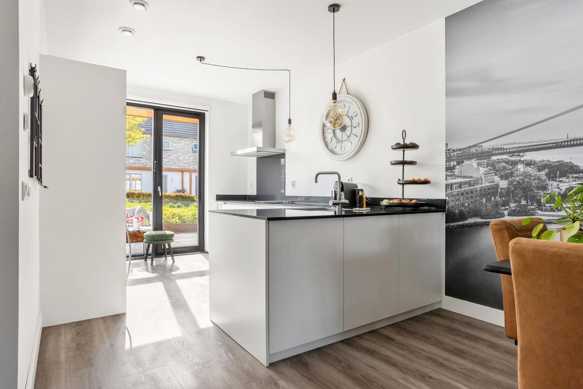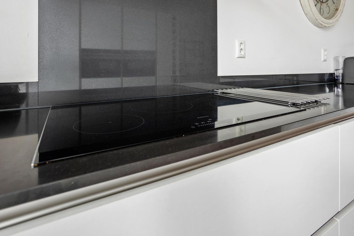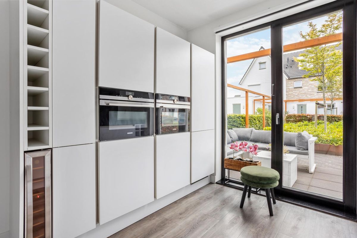 Aan de voorzijde van de woning ligt de stijlvolle woonkeuken – een echte blikvanger. De keuken is uitgevoerd met een granieten werkblad, een inductiekookplaat, dubbele oven, koelkast, vriezer en vaatwasser, allemaal van Siemens. Er is volop kastruimte, en dankzij de grote ramen en de gestucte wanden heeft de ruimte een lichte, moderne uitstraling.