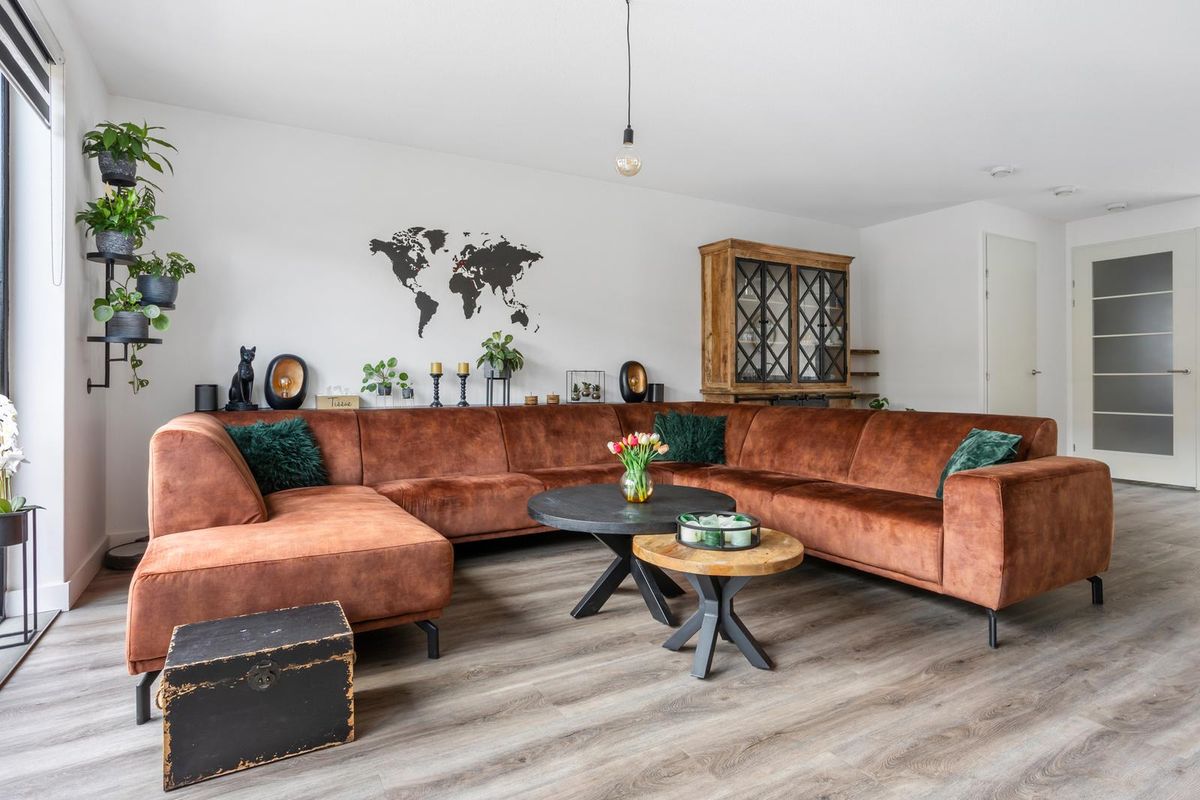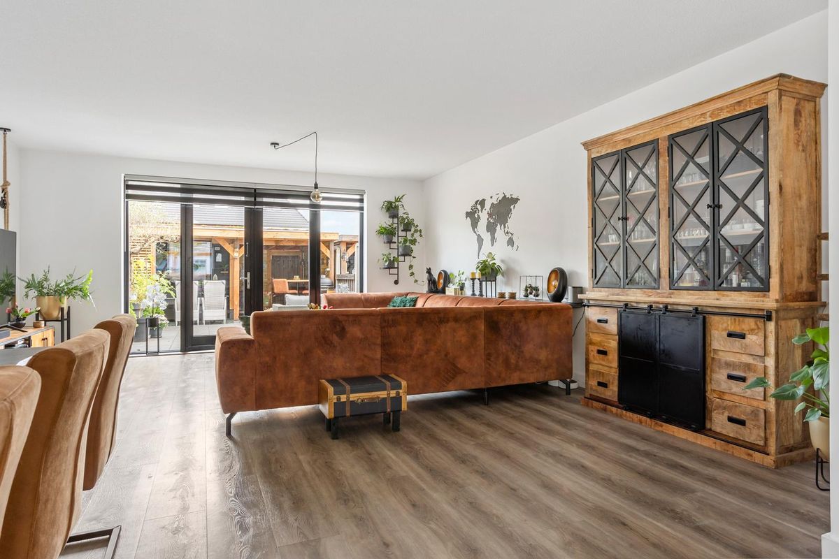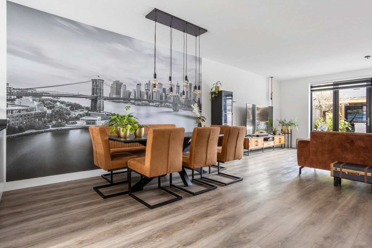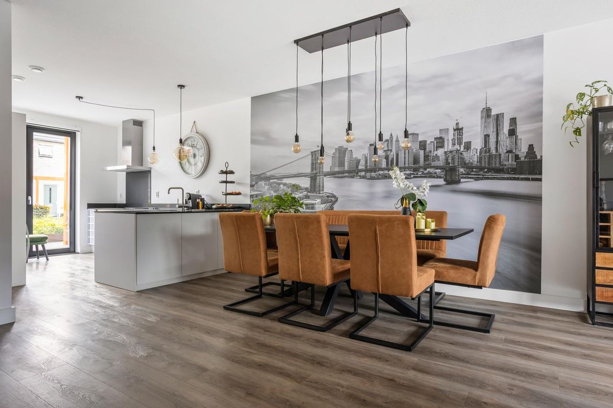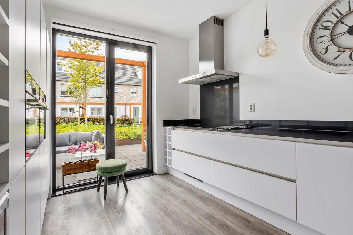 Aan de voorzijde van de woning ligt de stijlvolle woonkeuken – een echte blikvanger. De keuken is uitgevoerd met een granieten werkblad, een inductiekookplaat, dubbele oven, koelkast, vriezer en vaatwasser, allemaal van Siemens. Er is volop kastruimte, en dankzij de grote ramen en de gestucte wanden heeft de ruimte een lichte, moderne uitstraling.