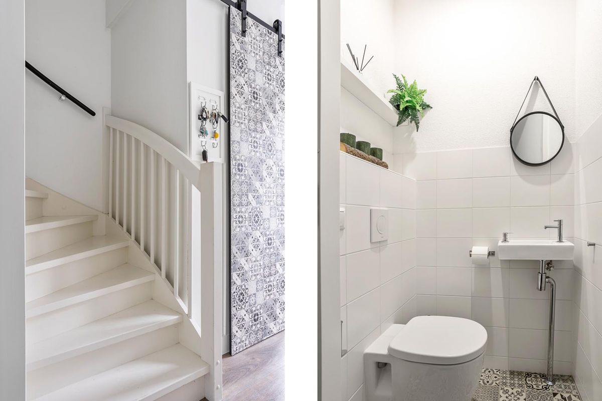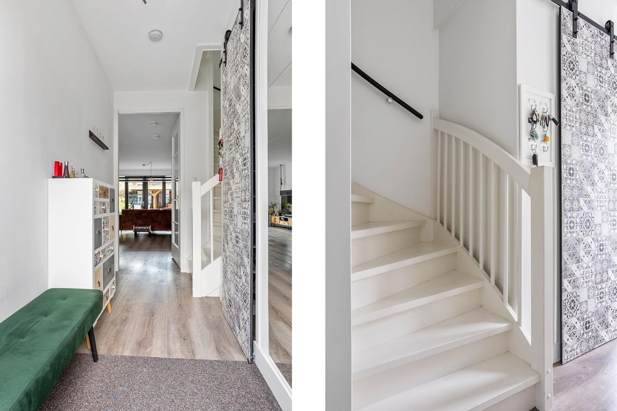 De woonkamer ligt aan de tuinzijde en beschikt over openslaande deuren naar de fraai aangelegde achtertuin. In de hal bevinden zich de meterkast en het moderne toilet met fonteintje. Via de houten trap bereik je de eerste verdieping, waar drie ruime slaapkamers te vinden zijn, allemaal met veel lichtinval. De badkamer is compleet uitgerust met een inloopdouche, wastafelmeubel, vrijhangend toilet, designradiator en een raam voor natuurlijk daglicht.
