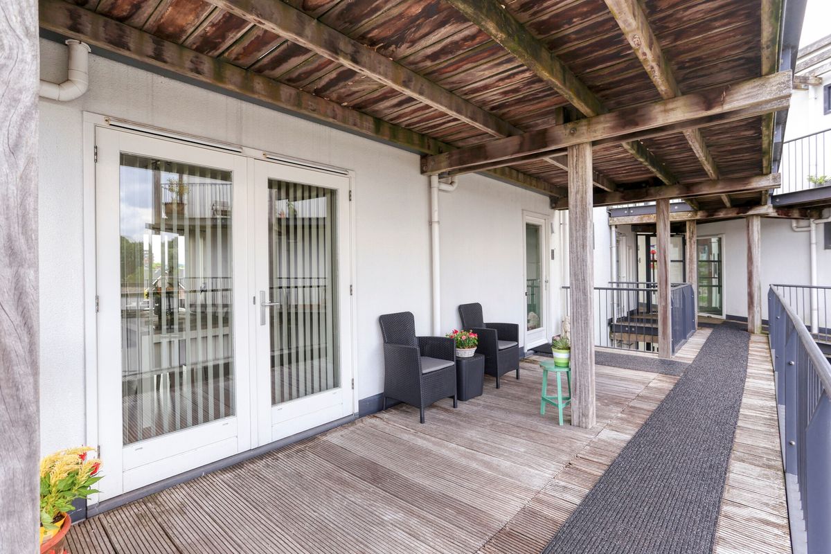 Dit meer dan royale balkon of desgewenst terras, kunt u bereiken via de voordeur, maar ook vanuit de woonkeuken. Vooral de robuuste houten balken naast en boven u geven deze plek karakter en een waar vakantiegevoel. U kijkt mooi weg over de daken naar de groenstrook erachter en de zon zorgt voor de rest.. Stelt u zich de zwoele zomeravonden eens voor: tafelen met vrienden, of een boek lezen met een heerlijk glas wijn. Tip: kijk ook even naar beneden, op de mooie binnentuin.