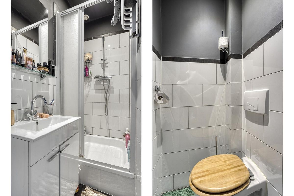 Een badkamer, gelegen naast de hal, is knus maar compleet. Volledig betegeld en voorzien van een douchecabine met schuifdeur en een wastafel met opbergmeubel, vormt deze ruimte een frisse en praktische plek. Daarnaast bevindt zich in de hal een separate toiletruimte, wat extra gemak biedt.