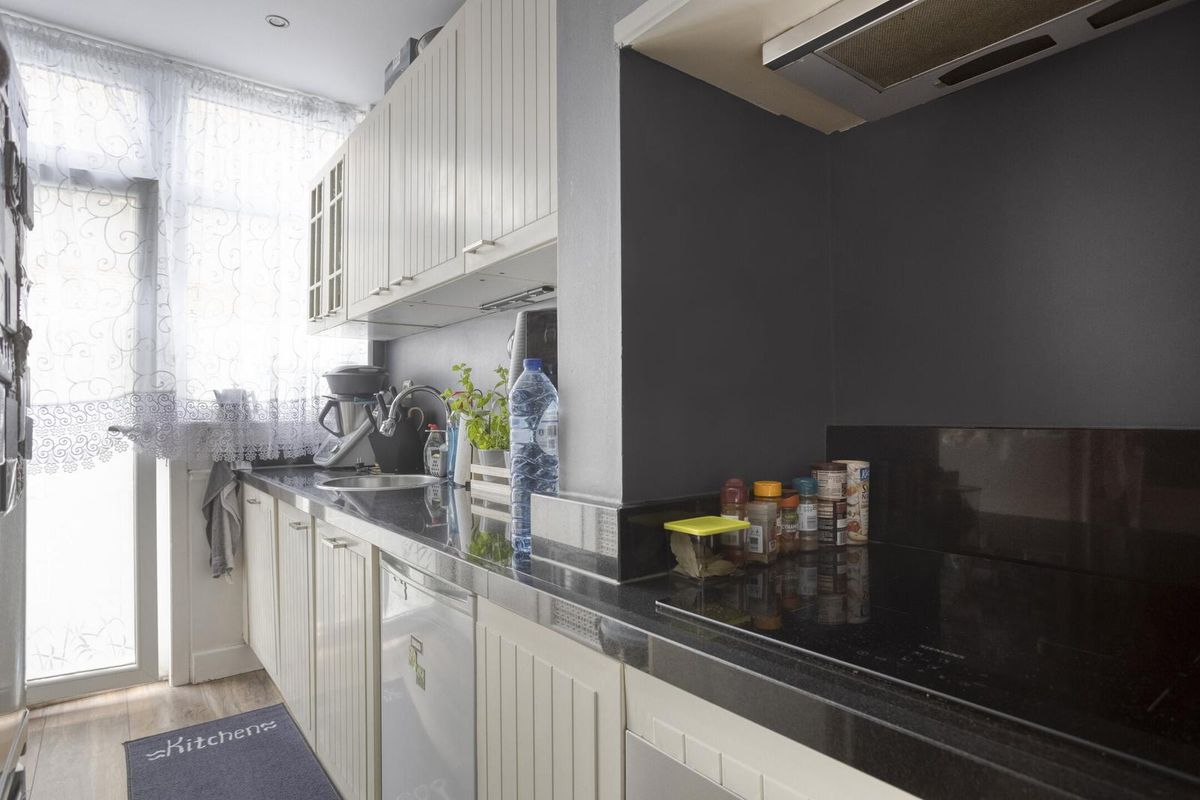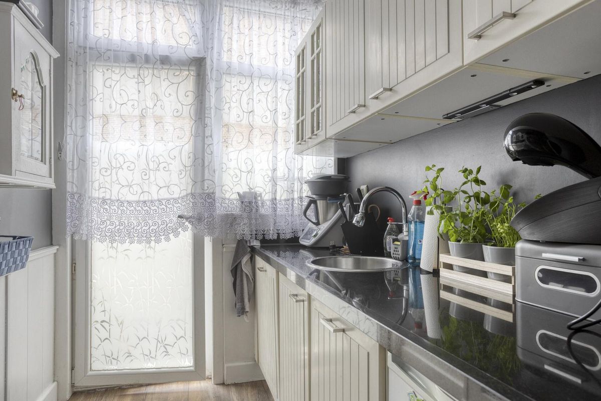 Een keuken grenst aan de hal en bevindt zich aan de achterzijde van de woning. Het langwerpige aanrecht is voorzien van diverse inbouwapparatuur, waaronder een inductiekookplaat, afzuiging en vaatwasmachine. De keuken is netjes onderhouden en direct bruikbaar, maar kan desgewenst naar eigen smaak worden gemoderniseerd. Via de achterdeur bereikt u de tuin, wat het praktisch en aangenaam koken maakt.