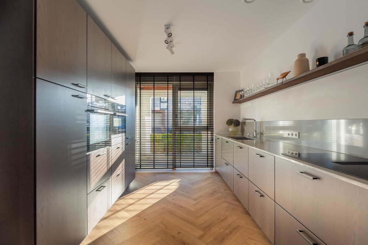 Grenzend aan de woonkamer ligt de moderne open keuken. Strak vormgegeven en voorzien van alle gemakken: een geïntegreerde afzuiging, vaatwasser, koelkast, vriezer, combi-oven en magnetron. Dankzij de slimme indeling en veel kastruimte blijft alles netjes en overzichtelijk. De open opzet zorgt ervoor dat je tijdens het koken altijd verbonden blijft met de rest van de ruimte.