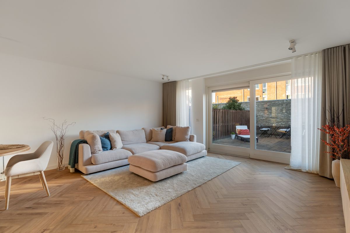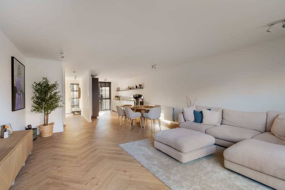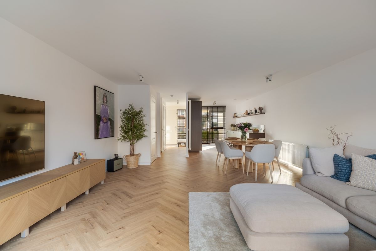 De woonkamer is een plek om tot rust te komen. Grote ramen zorgen voor een overvloed aan daglicht en een fijne verbinding met buiten. De strakke afwerking en neutrale kleuren maken het eenvoudig om jouw eigen stijl toe te voegen.