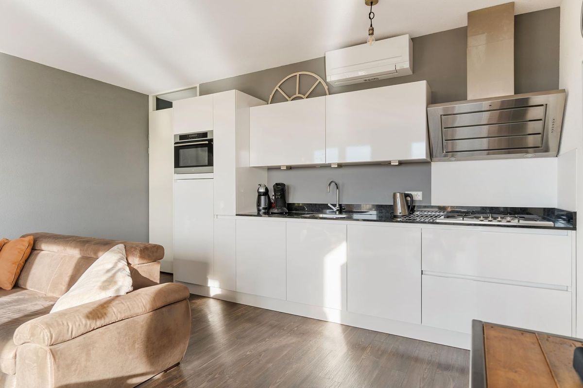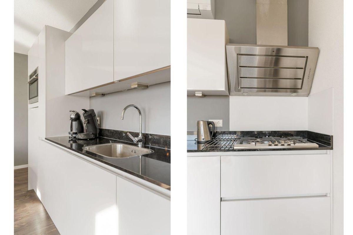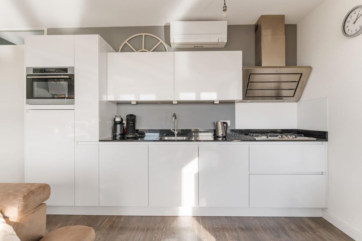 De open keuken vormt één geheel met de woonkamer en is uitgevoerd in een rustige, tijdloze stijl met gebroken witte kastjes en een zwart natuurstenen werkblad. De keuken is voorzien van een oven/magnetron, vaatwasser en koel-vriescombinatie.