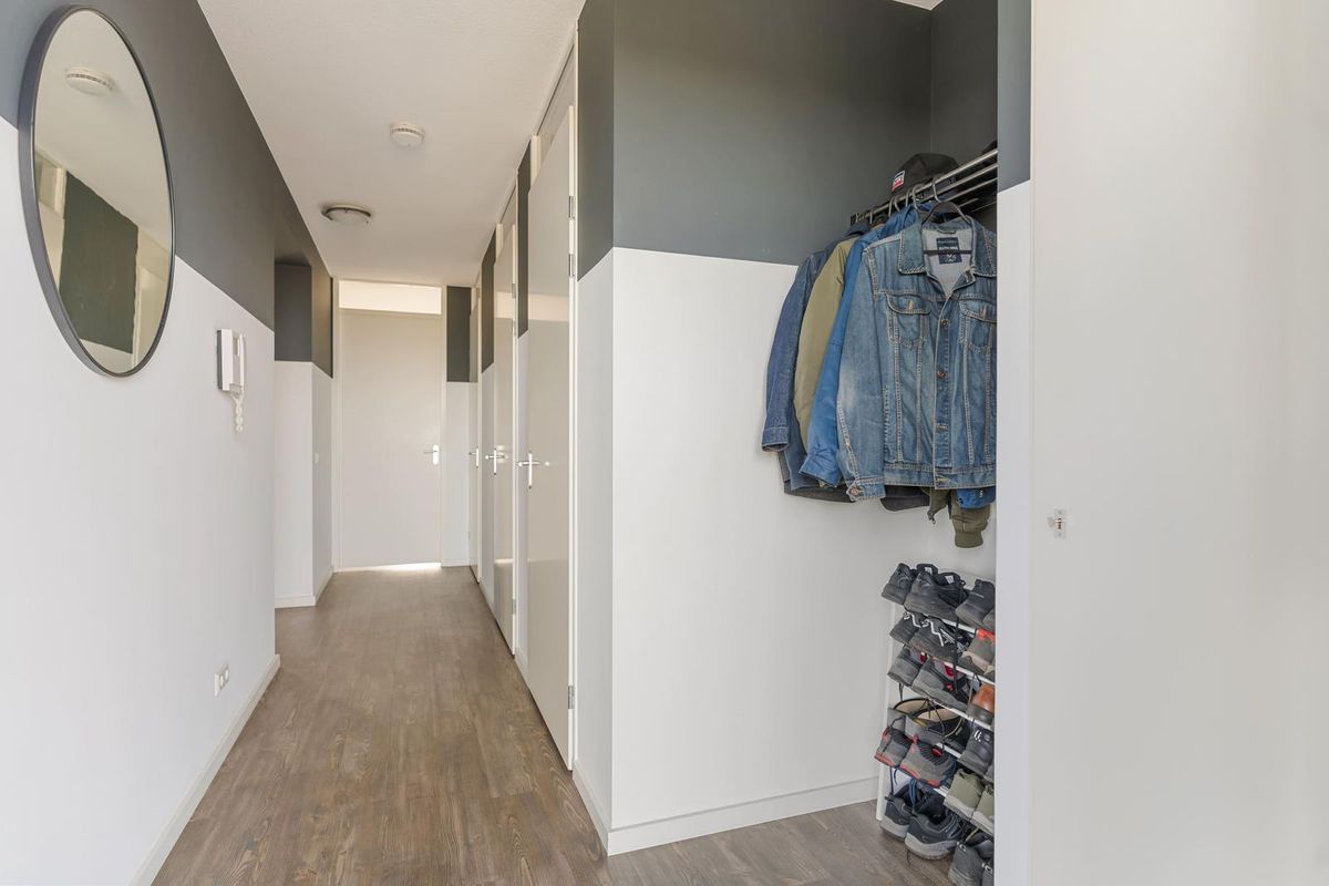 De entreehal biedt toegang tot nagenoeg alle vertrekken en beschikt over een meterkast, separate berging, toiletruimte en cv-ruimte. De woonkamer is een lichte, uitnodigende ruimte met twee keer openslaande deuren naar Franse balkons en nog een derde set deuren naar het ruime balkon op het zuidoosten. Dankzij deze ligging geniet je van volop zon en een fraai uitzicht over het groen.