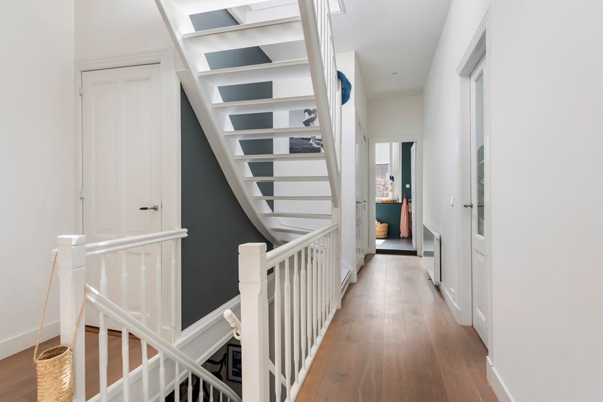 Portiek, entree via een trap vanaf straatniveau. Hal met trap naar de woonverdieping, uitkomend in de gang.
