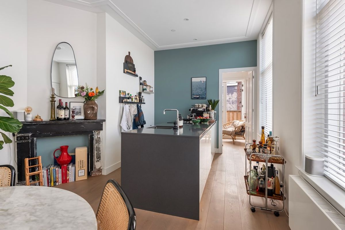De lichte woonkamer en suite beschikt over originele ornamenten en grote raampartijen, wat zorgt voor een prettige en open sfeer. De keuken is voorzien van inbouwapparatuur, waaronder een vaatwasser, oven, inductiekookplaat en koelkast.