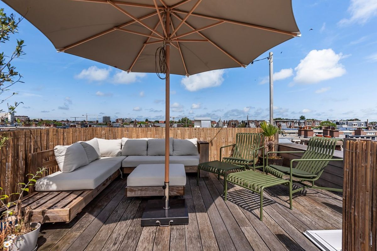 Via een vaste trap in de gang is het ruime dakterras bereikbaar. Het terras biedt een vrij uitzicht en veel privacy. Daarnaast is er een buitendouche aanwezig, ideaal voor verkoeling op warme dagen.
