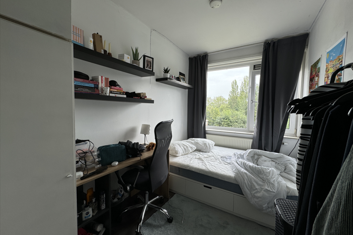 kamer 2 is gelegen op de derde verdieping aan de achterzijde van het pand en heeft een oppervlakte van 9,49 m². Er is voldoende ruimte voor een bed, een bureau, een kledingkast en eventueel een kleine zithoek. Kamer 3 is gelegen op de derde verdieping aan de achterzijde van het pand en heeft een oppervlakte van circa 8,43m². De badkamer bevindt zich ook op de derde etage en wordt gedeeld met 2 medebewoners. De gedeelde keuken is ruim en voorzien van alle noodzakelijke gemakken zoals een vaatwasser, koelkast, combinatie oven-magnetron en inductiekookplaat. Tot slot is er een ruime gemeenschappelijke woonkamer aanwezig van 21,77 m².