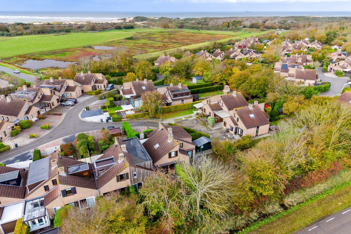 De woning beschikt over fijne buitenruimtes waar je op elk moment van de dag kunt genieten. Aan de voorzijde ligt de voortuin op het westen met een overkapping, ideaal om beschut te zitten en tot in de avond van de zon te genieten. Hier bevindt zich ook een houten berging voor fietsen en strandspullen.