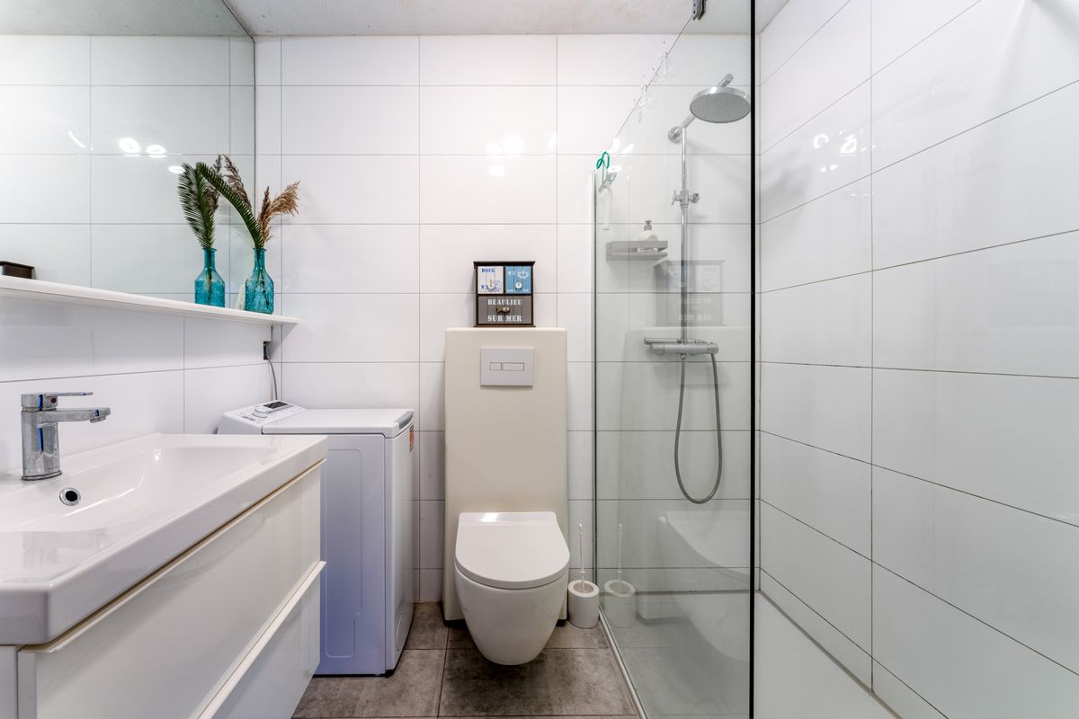 De badkamer op de begane grond is net afgewerkt en voorzien van een douche, wastafel en toilet.