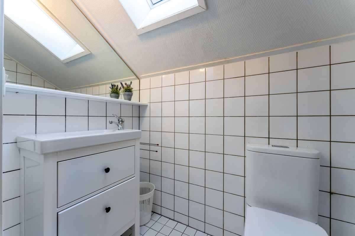 Op deze verdieping bevindt zich tevens de tweede badkamer, uitgerust met toilet, wastafel en een dakraam dat voor extra daglicht zorgt. De plattegrond visualiseert de overzichtelijke en efficiënte indeling.