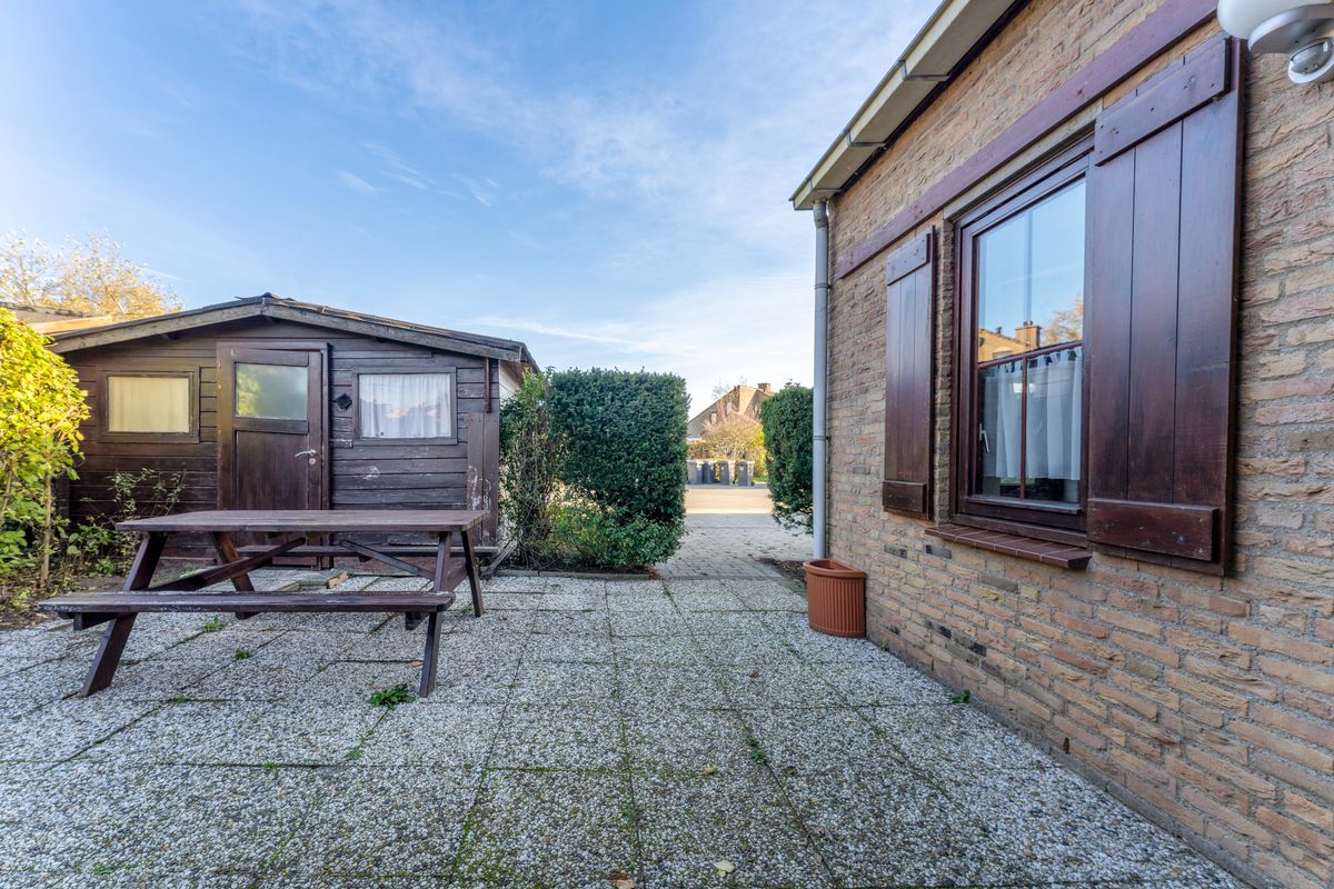 De voortuin biedt ruimte om twee auto’s op eigen terrein te parkeren en geeft toegang tot de houten berging, die verrassend ruim is en perfect voor fietsen, strandspullen en tuingereedschap. Via de zijkant van het huis loop je gemakkelijk naar de achtertuin, waardoor beide zijden van het perceel goed bereikbaar zijn.