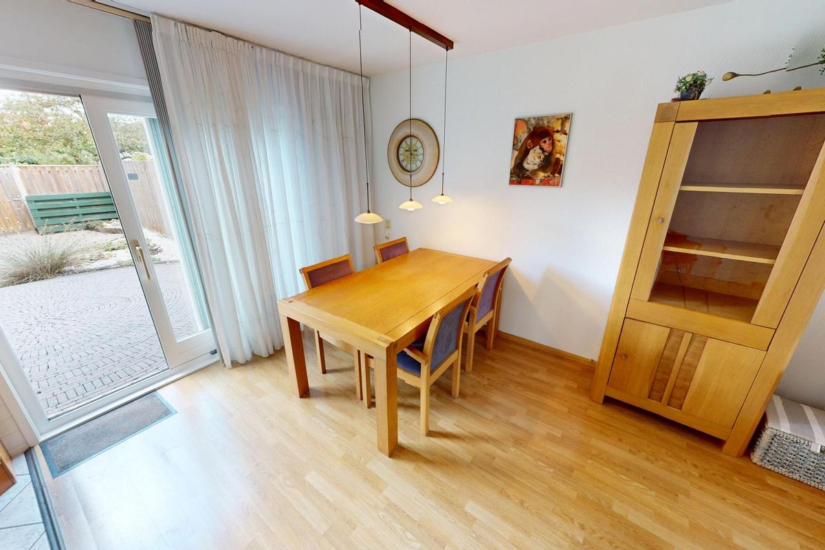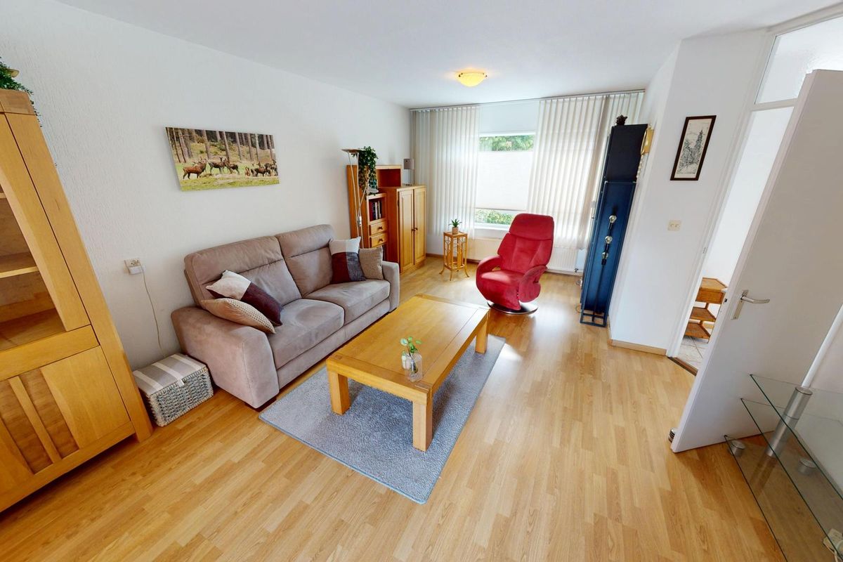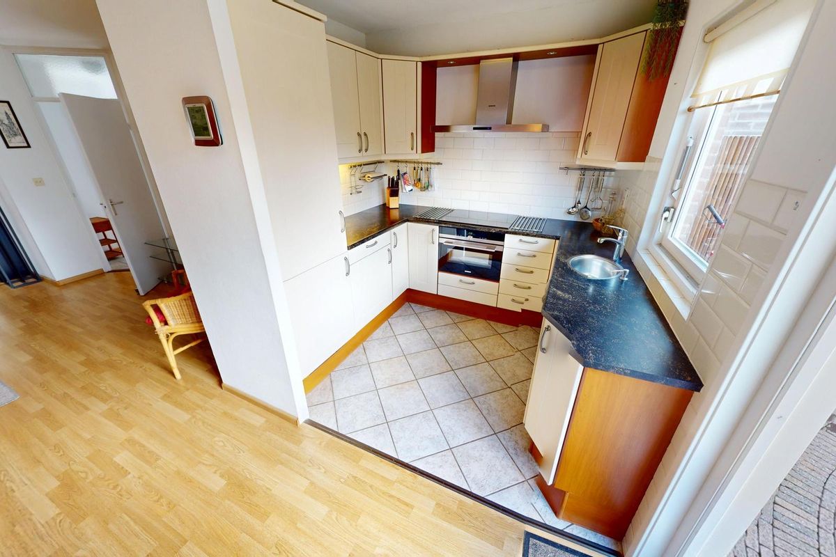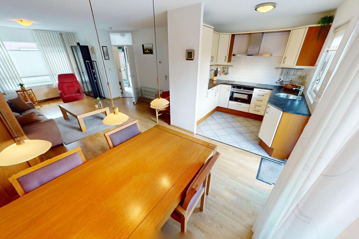 Vanuit de hal kunt u de L-vormige woonkamer bereiken. Door de grote raampartij aan de voorzijde van de woning heeft u veel lichtinval in de woning. U heeft hier de mogelijkheid om een lekkere loungebank te plaatsen. Vanuit de bank heeft u dan fijn zicht op de straat aan de voorzijde. Halverwege de woonkamer is een vaste kast aanwezig. Ideaal om als een extra opbergruimte te gebruiken. Aan de achterzijde van de woning treft u naast de open keuken, ook een schuifpui aan wat een fijne overgang naar de tuin verzorgd.