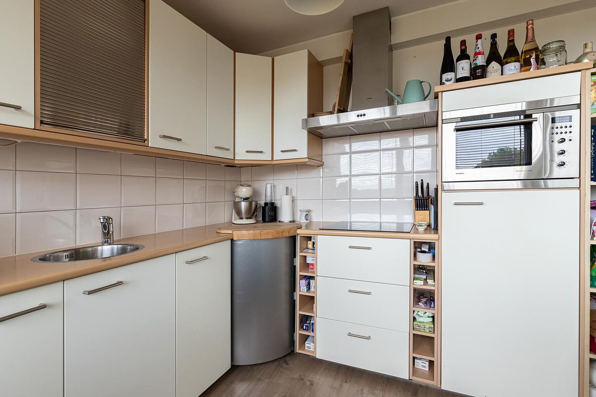 De halfopen keuken is praktisch én stijlvol, met crème-witte fronten, een houtlook werkblad en moderne inbouwapparatuur zoals een inductiekookplaat, combimagnetron, vaatwasser, koel-vriescombinatie en afzuigkap.