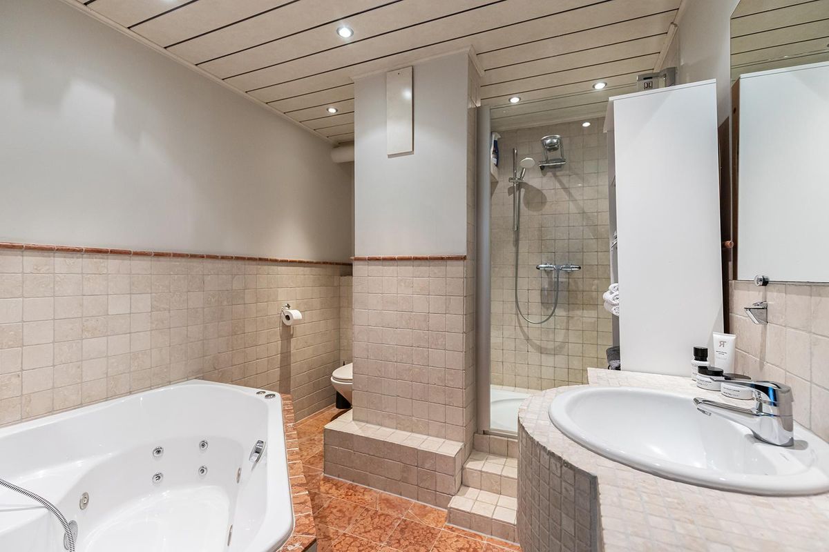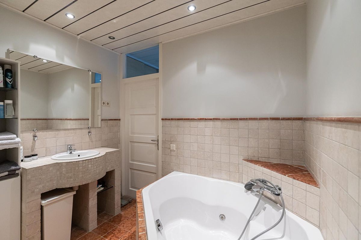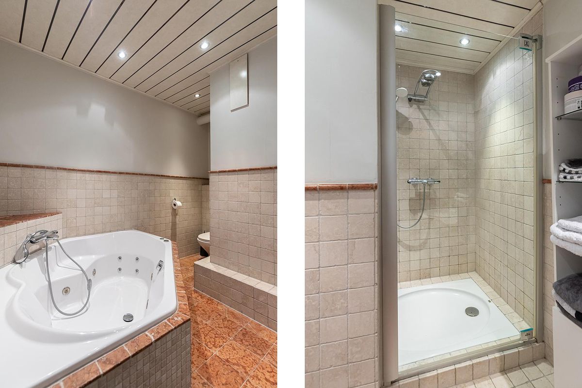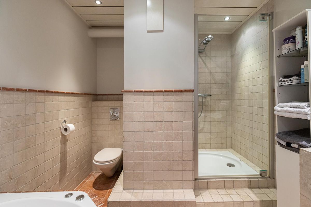 De badkamer is compleet uitgerust met een whirlpool-ligbad, aparte douche, wandtoilet en wastafelmeubel. Dankzij de inbouwspotjes in het plafond oogt de ruimte modern en fris. Verder ligt er door het hele appartement een nette laminaatvloer.