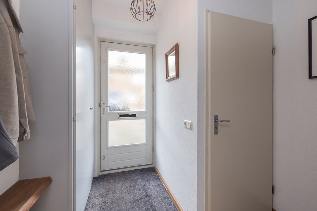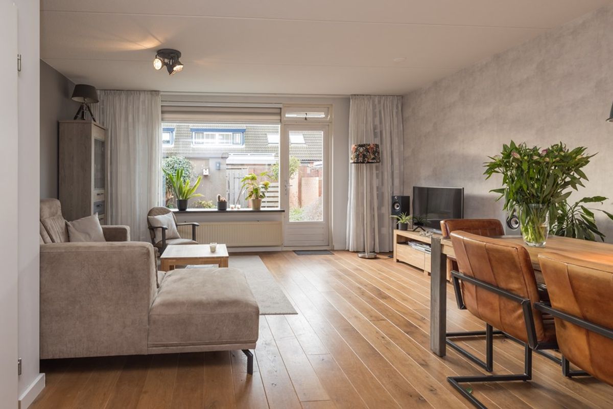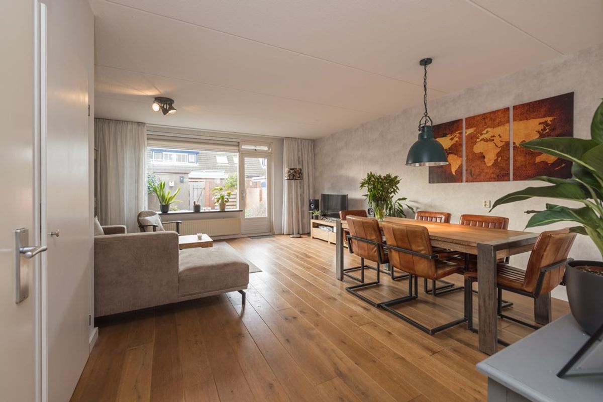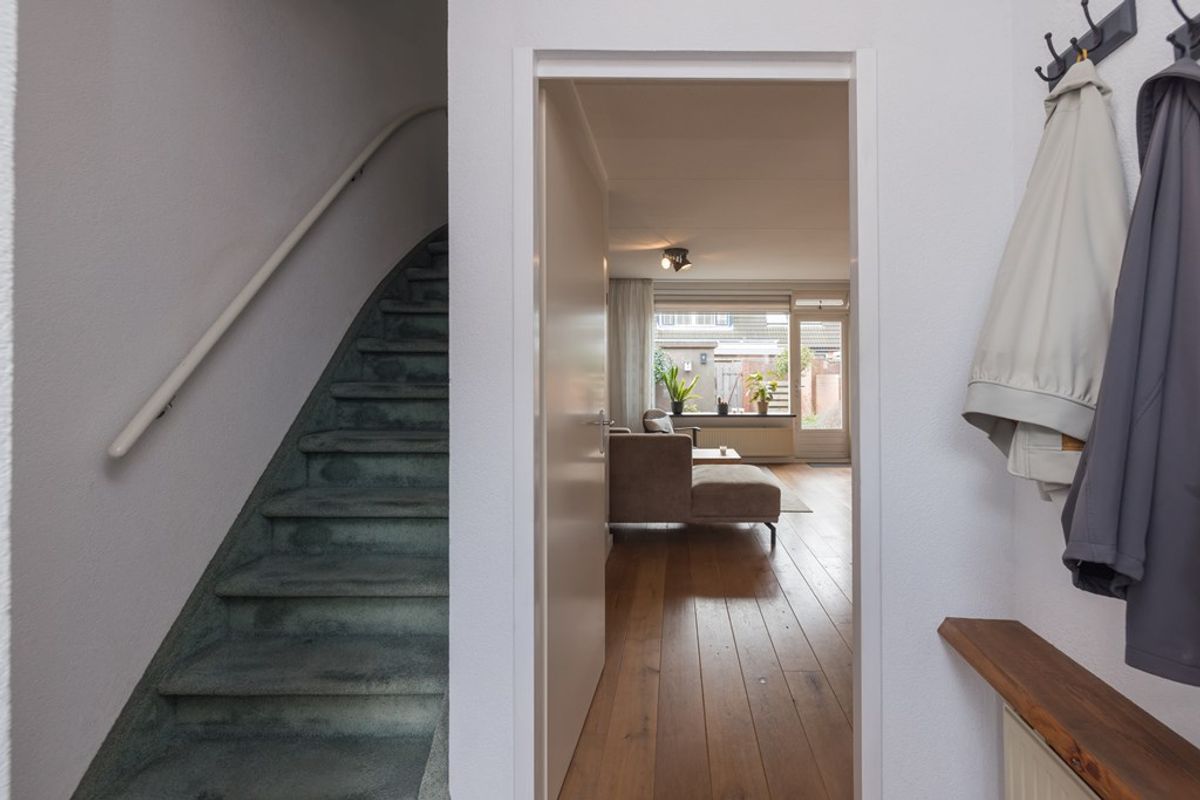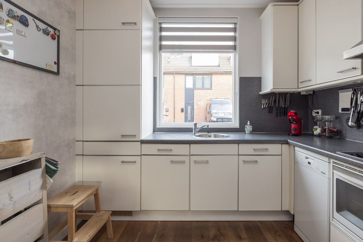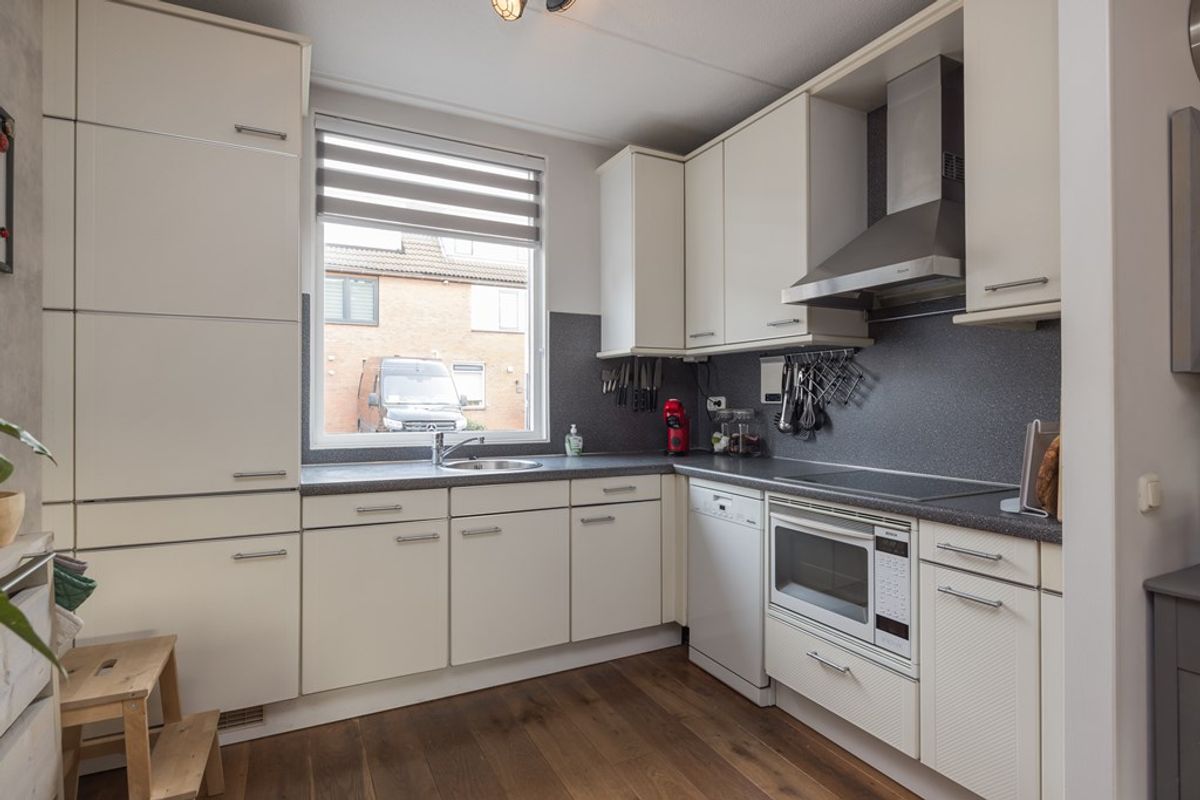 Entree, hal met de meterkast, de garderobe en de toiletruimte. Een heerlijke lichte op de tuin gerichte woonkamer met een kast onder de trap en een deur naar de achtertuin. De in lichte kleur uitgevoerde keuken is voorzien van diverse inbouwapparatuur zoals een koelkast, een vriezer, een vaatwasser, een magnetron, een keramische kookplaat en een afzuigkap.