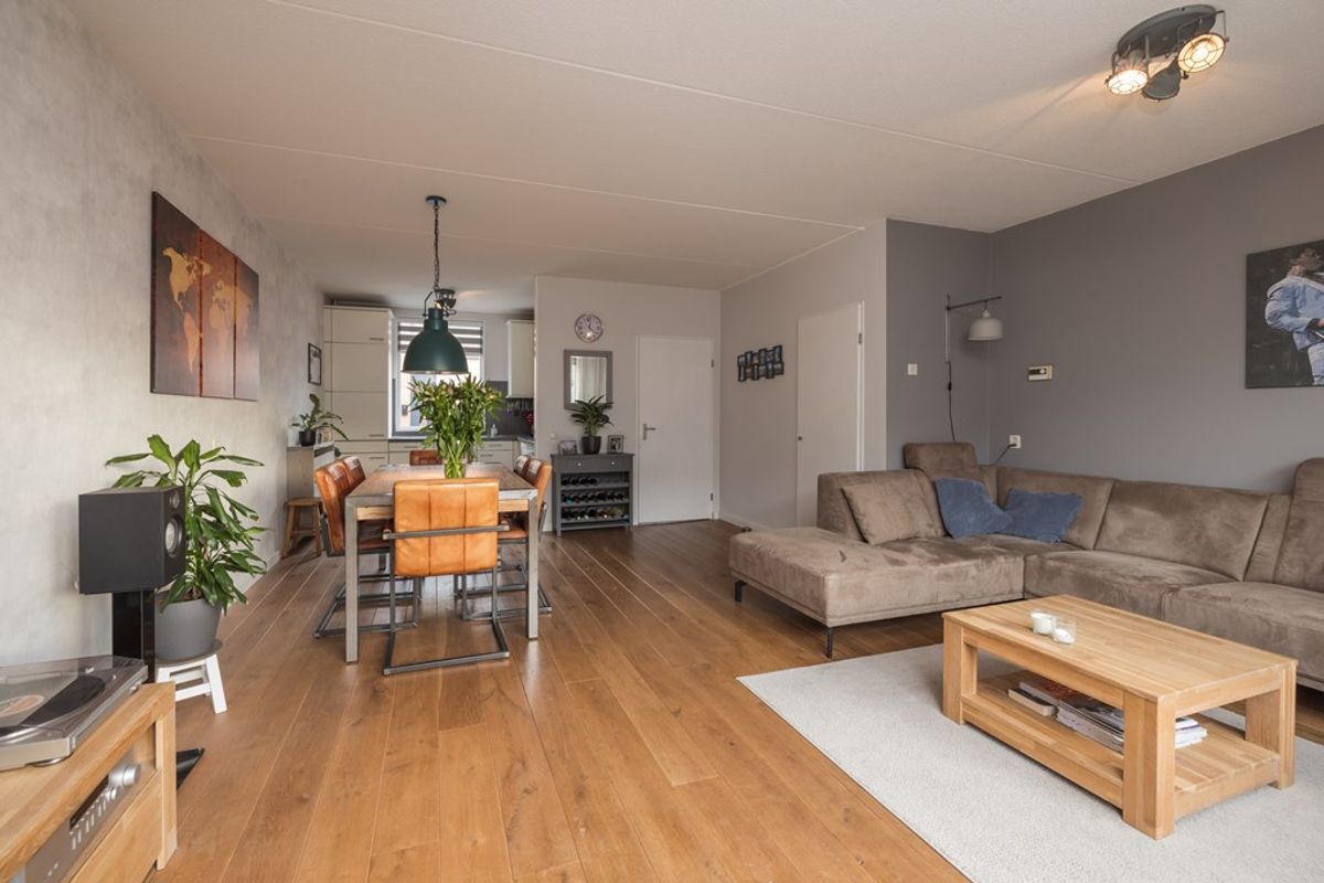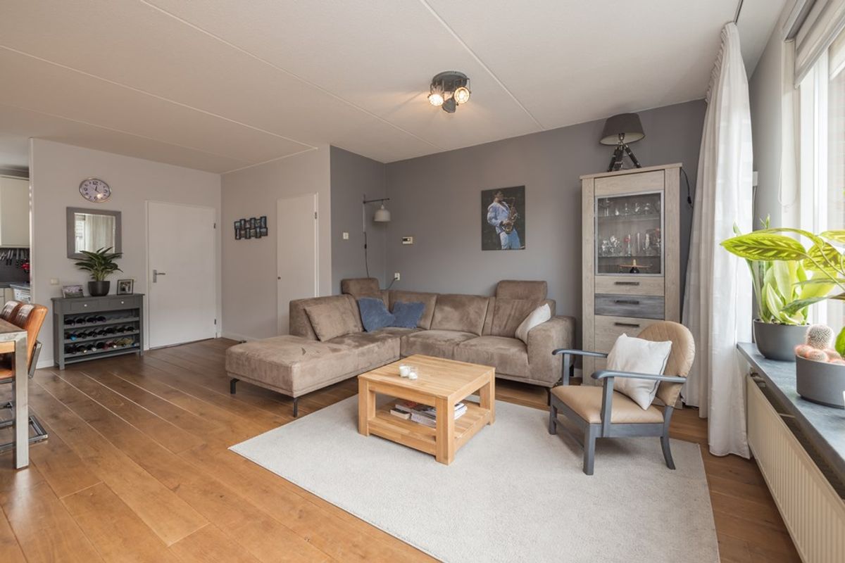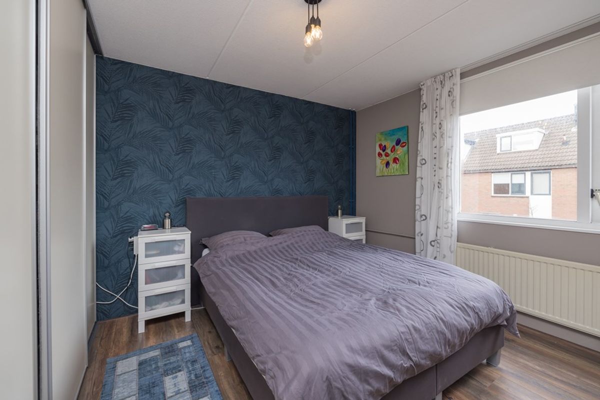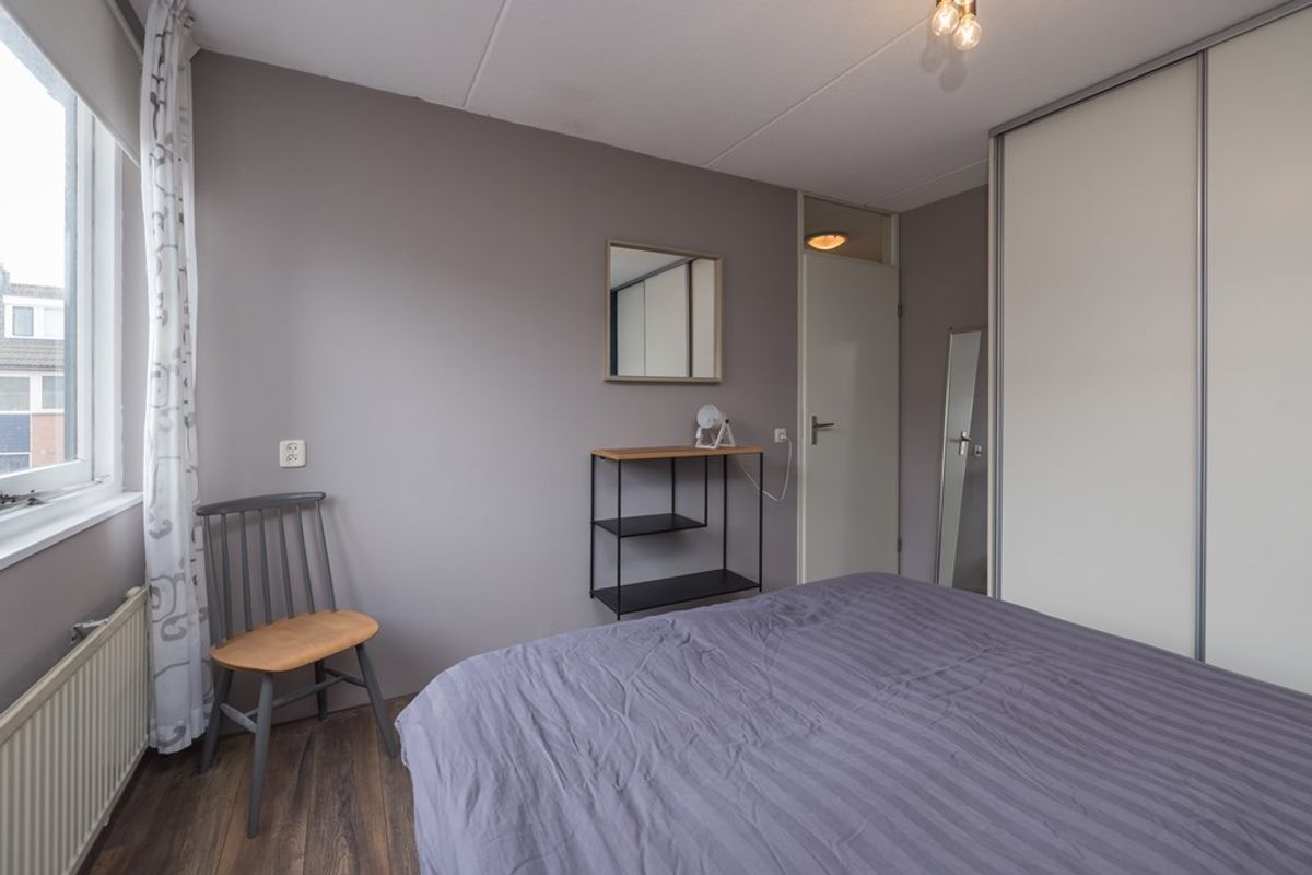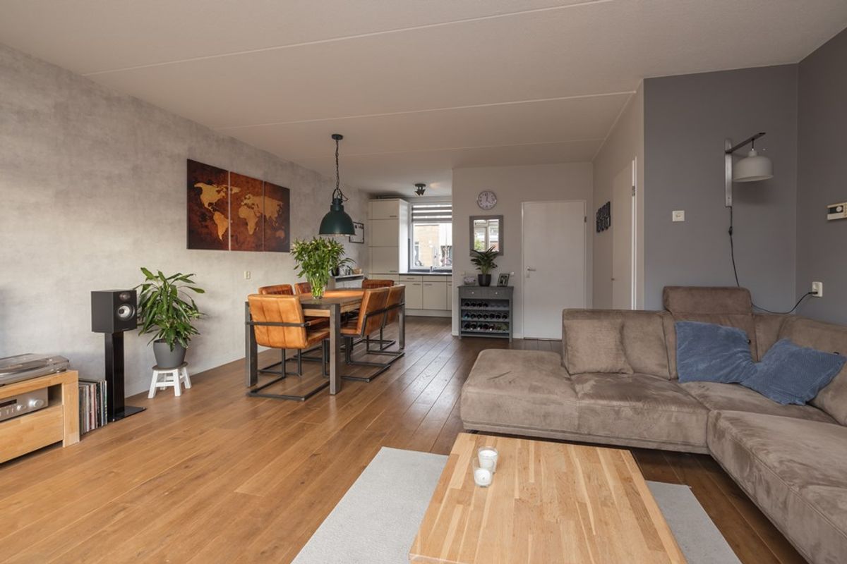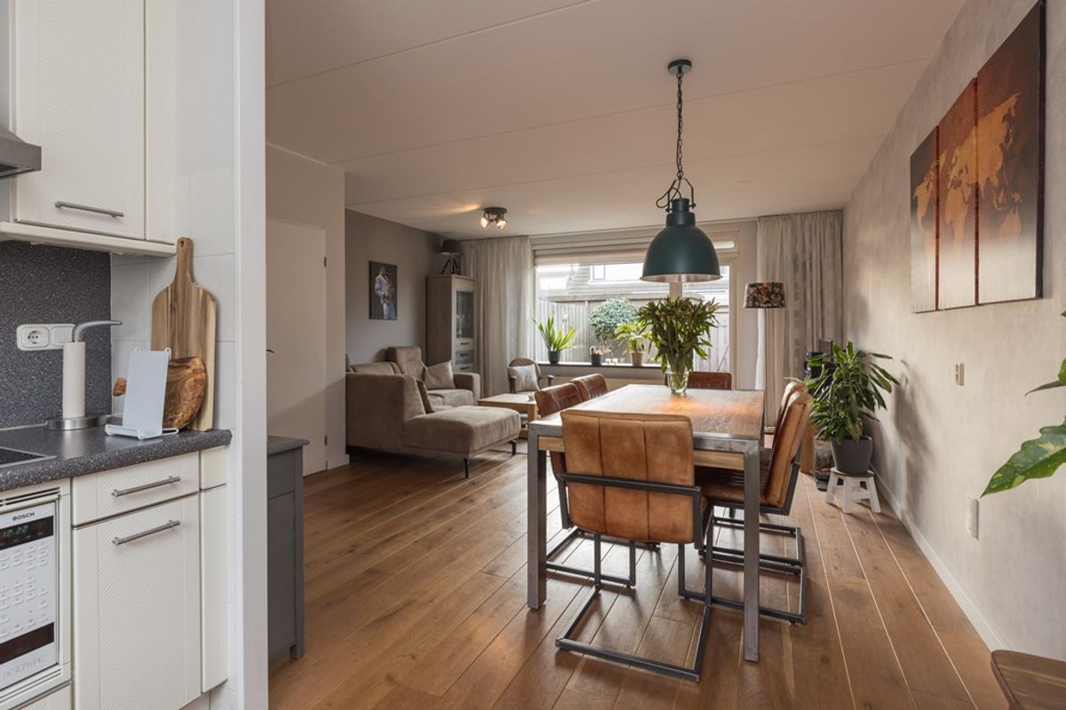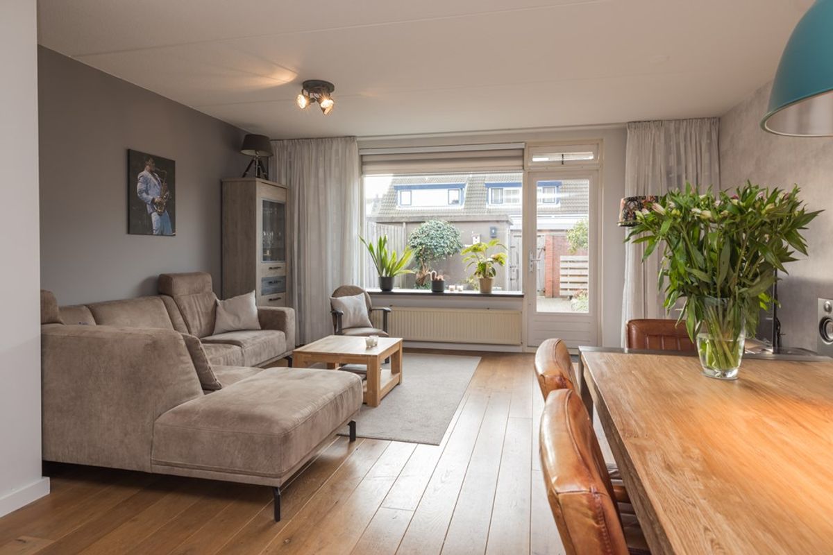 Entree, hal met de meterkast, de garderobe en de toiletruimte. Een heerlijke lichte op de tuin gerichte woonkamer met een kast onder de trap en een deur naar de achtertuin. De in lichte kleur uitgevoerde keuken is voorzien van diverse inbouwapparatuur zoals een koelkast, een vriezer, een vaatwasser, een magnetron, een keramische kookplaat en een afzuigkap.
