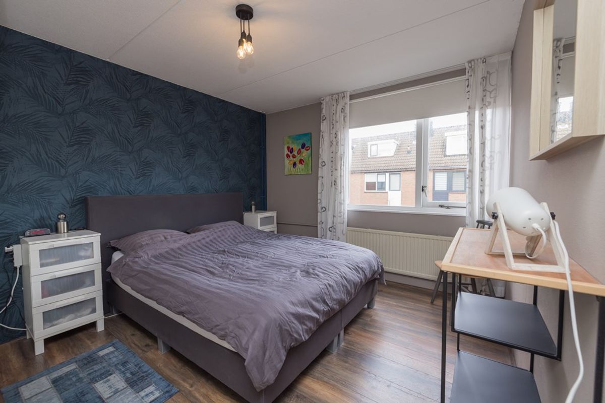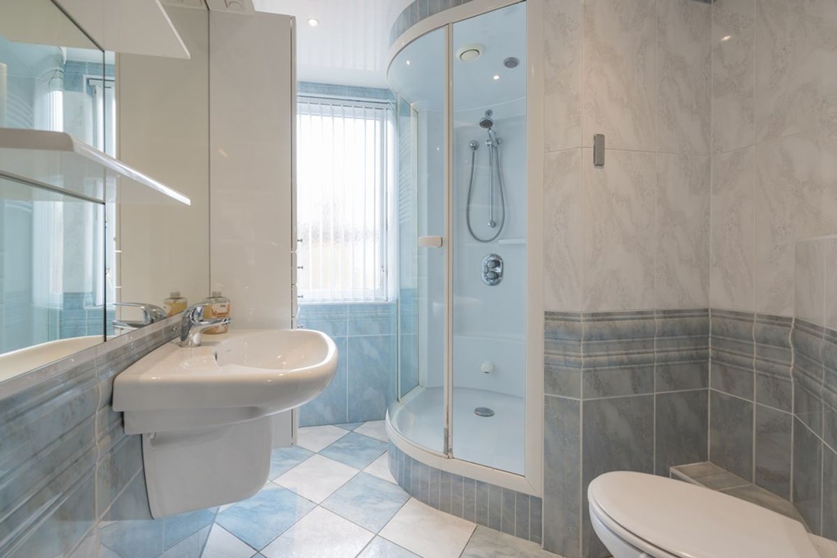 De overloop met aan de voorzijde de ouderslaapkamer met een ingebouwde kast met schuifpanelen. De badkamer heeft een wandcloset, ventilatie, een wastafel en een douchecabine met een zitje. Aan de achterzijde zijn er twee volwaardige slaapkamers, beiden met een dakraam en een laminaatvloer.