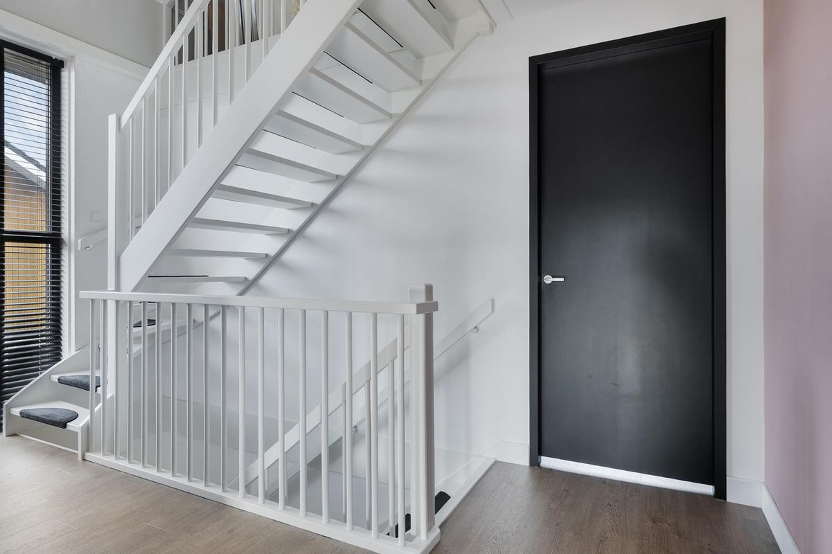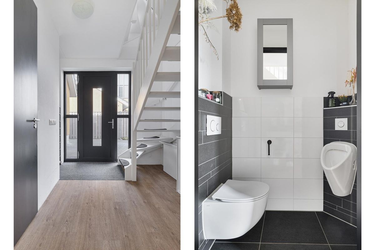 Je komt binnen in een stijlvolle hal met luxe toilet, voorzien van fontein en urinoir. Vervolgens opent de lichte, royale woonkamer met schuifpui naar de tuin zich – een heerlijke leefruimte waar binnen en buiten naadloos in elkaar overgaan.