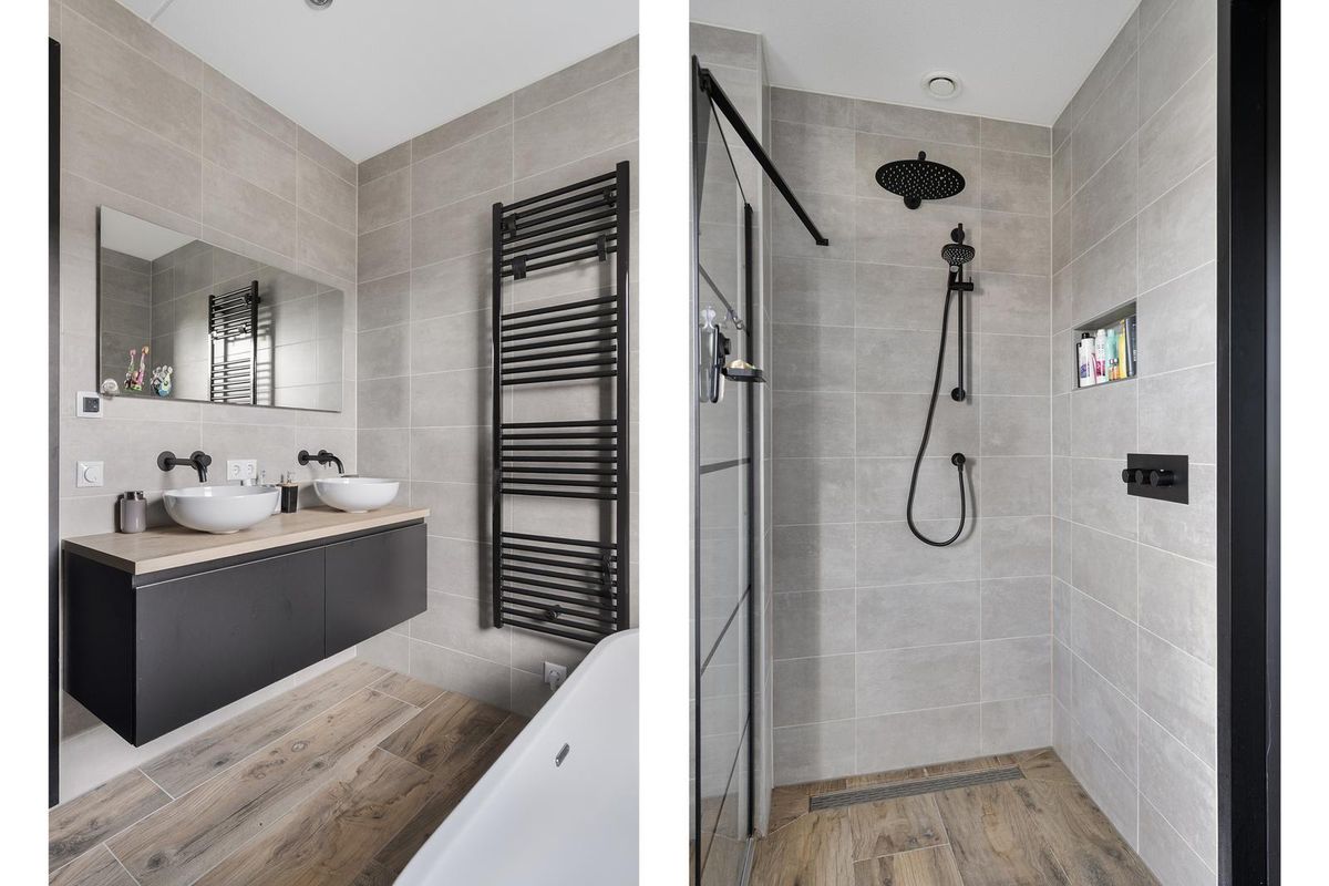 Op de eerste verdieping bevinden zich drie royale slaapkamers, waaronder de master bedroom met inloopkast. De modern afgewerkte badkamer met vloerverwarming heeft een inloopdouche, ligbad, tweede toilet en een wastafelmeubel met dubbele waskom. Dankzij vloerverwarming en een designradiator geniet je hier van optimaal comfort.